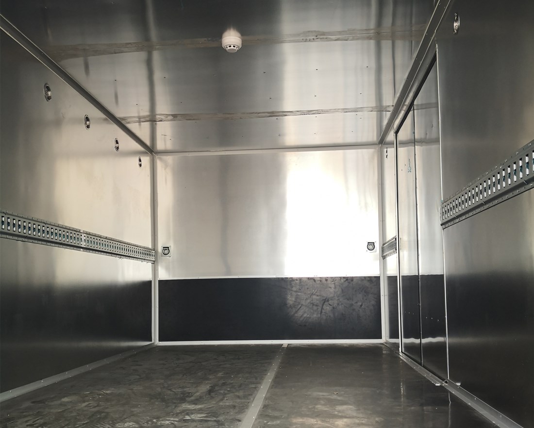 廂體配置:貨廂尺寸為4730X2050X1750(mm)、廂體外飾冷板、內飾鋁板、中間為防阻燃泡沫、廂內安裝臥環、煙霧報警器、防盜報警器、右邊開側門、后雙開門、帶拖地靜電帶,其它均按廠標組織生產;
