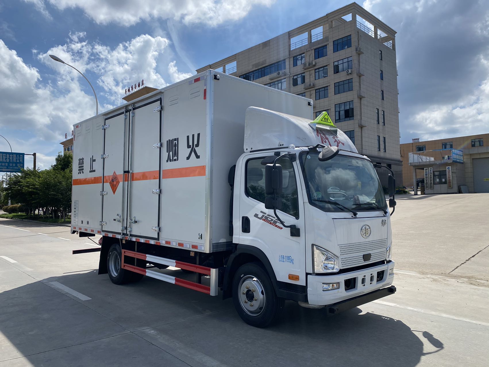 嚴格按照公告尺寸制作。外板采用烤漆板帶百葉窗,內飾為導電性能良好的鋁平板有透氣孔,矩形骨架結構內部填充防火阻燃材料,復合加鉚合工藝。廂體四周鋁合金包邊及包角,車廂底板3mm鋪設防靜電膠皮,廂體前臉50公分高鋪設防靜電膠皮。后部設置對開門,右側單開門,廂體內部兩側安裝捆綁貨物的臥環。廂體內部安裝煙霧報**器及防盜報**感應器。車廂一周粘貼橙色反光帶,箱體粘貼 菱形標志牌,安全告示牌,危險品牌,箱體安裝示廓燈(前白后紅),拖地靜電帶。