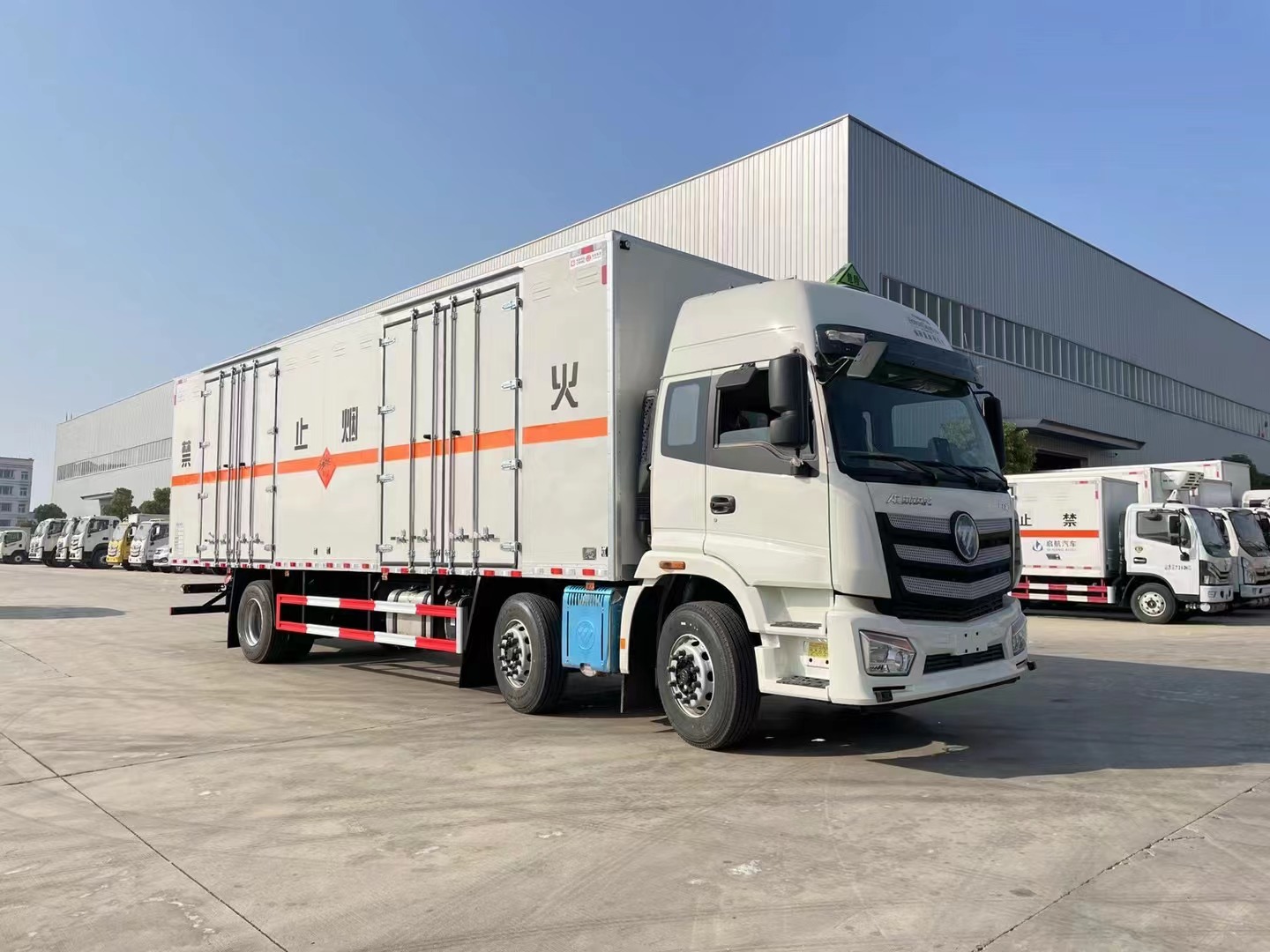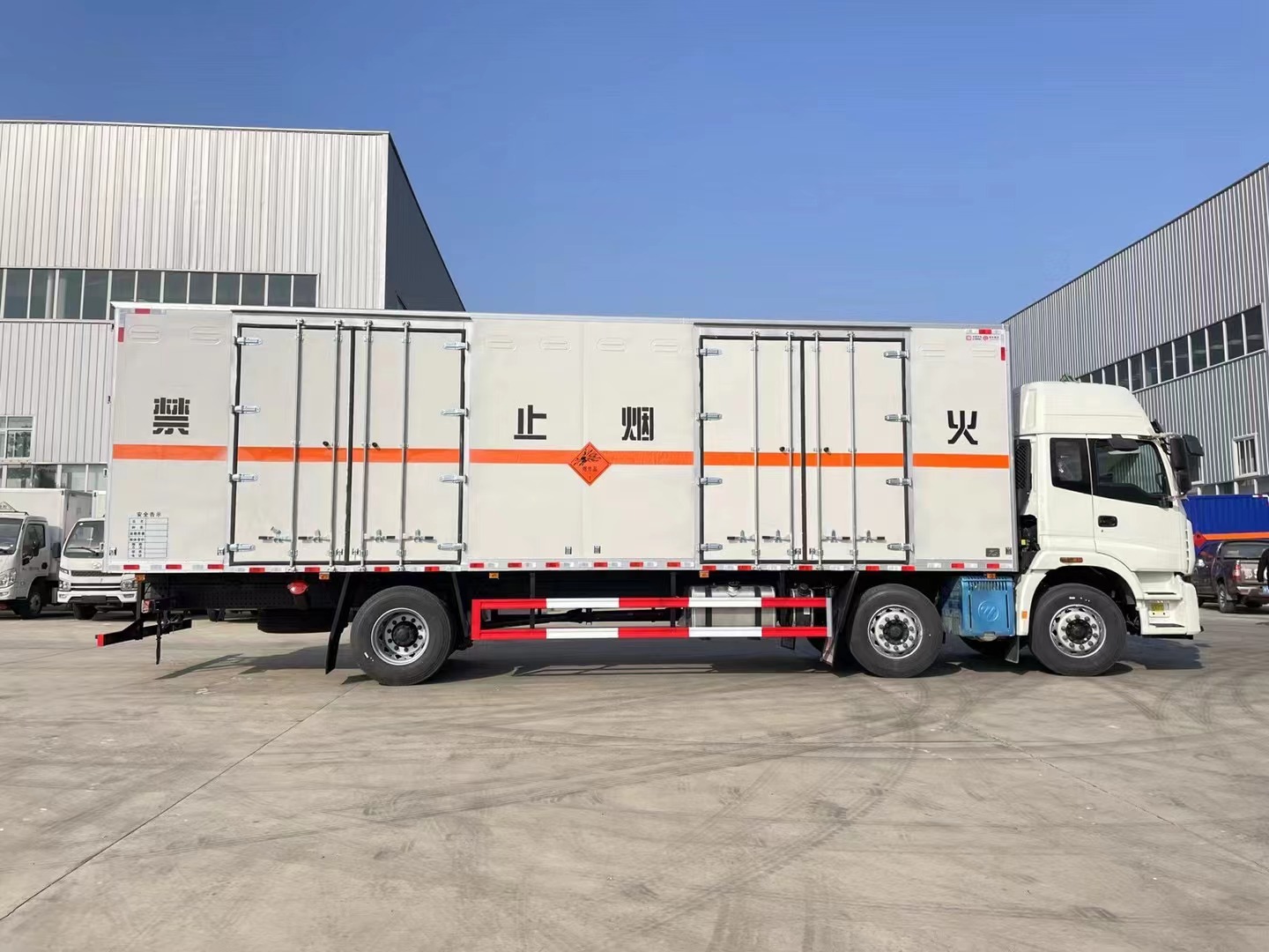 嚴格按照公告尺寸制作。外板采用烤漆板帶百葉窗,內飾為導電性能良好的鋁平板有透氣孔,矩形骨架結構內部填充防火阻燃材料,復合加鉚合工藝。廂體四周鋁合金包邊及包角,車廂為平板上鋪設防靜電膠皮,廂體前臉50公分高鋪設防靜電膠皮。廂體右側一組雙開門,后部設置對開門,廂體內部兩側安裝捆綁貨物的臥環。廂體內部安裝煙霧報**器及防盜報**感應器。車廂一周粘貼橙色反光帶,箱體粘貼 菱形標志牌,安全告示牌,危險品牌,箱體安裝示廓燈(前白后紅),拖地靜電帶。廂體優點:后門及側門采用一次成型密封膠條,底板做防銹處理,箱體采用烤漆工藝制作(10年不掉漆),所有門桿及合頁均為熱鍍鋅材質。