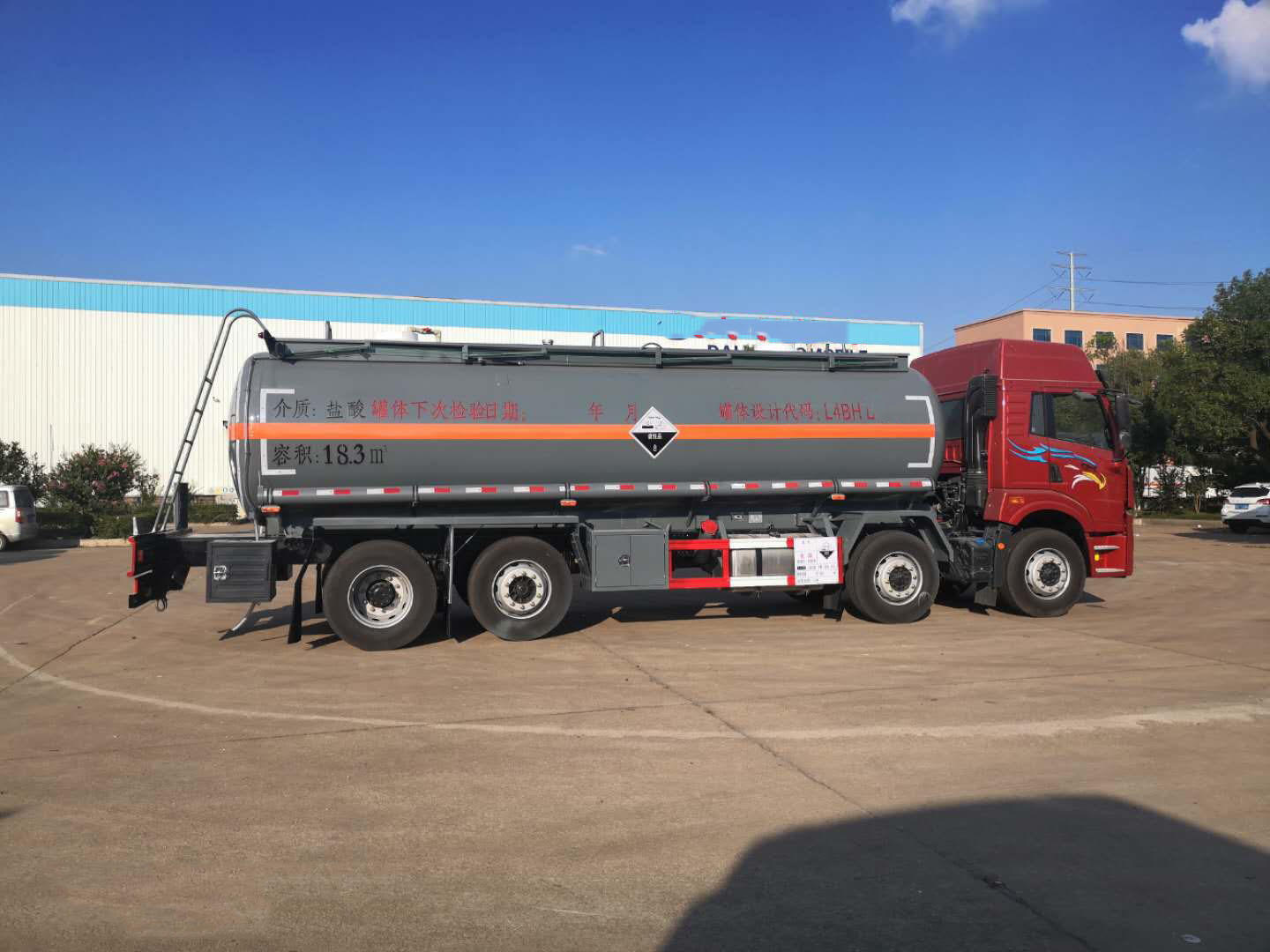 解放前四后六腐蝕品物品運輸車采用解放原廠危貨底盤,悍V2.0平地板高頂全浮駕駛室(四點空氣懸置),錫柴CA6DL1-26E5,陜齒9JS119A,457升級沖焊橋(速比4.875),295/80R22.5-18PR層級,280*80*(8+5),發動機長換油,空調,電動門窗,電動舉升,中控鎖,帶國產EBS,板簧10/10/8+-/2+-,4氣囊,北斗+GPRS行車記錄儀,前下防護,220V電源+巡航系統,高爆壓版,限速89KM/H,400L鋁油箱,真皮通風座椅(腰托、扶手),多功能方向盤,雨眉,前盤后鼓制動器,限速79KM/H,排氣管前置,排氣火花熄滅器,帶靜電拖地帶,前橋及隨動橋帶爆胎應急,帶進口ECAS,電控氣囊懸掛,國產FCW/LDWS。軸距:1900+4160+1350mm。