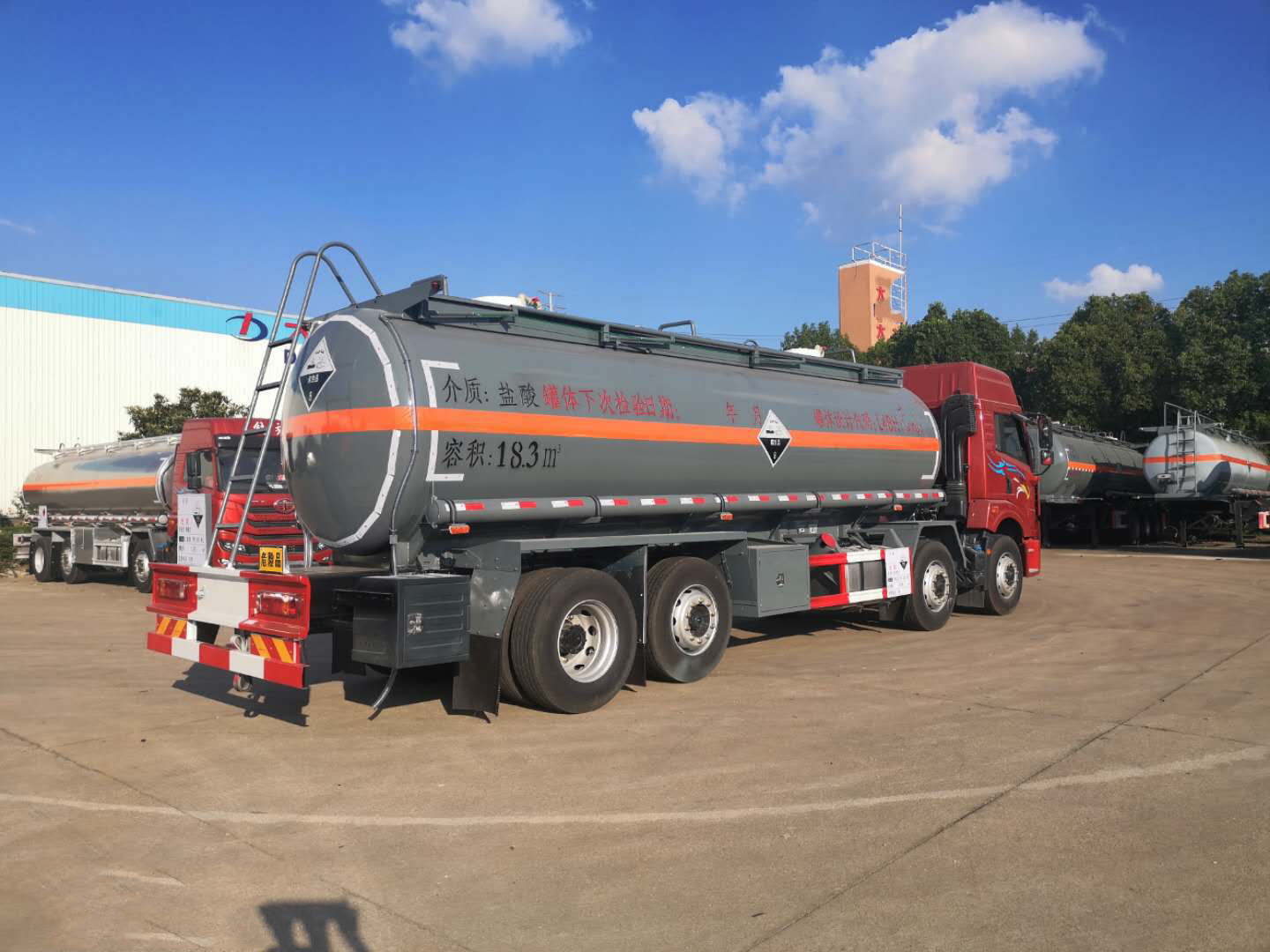 解放前四后六腐蝕品物品運輸車罐體采用碳鋼Q235制作,筒體厚度封頭厚度按GB18564設計,罐內聚乙烯滾塑16MM厚,罐頂單層圍板,圍板內做瀝青漆防腐,罐頂兩側配活動護欄,罐頂安裝2個全塑人孔蓋,2個通氣閥,罐頂預留1個安全閥法蘭。罐體底部底口位置加裝一個DN100不銹鋼襯氟海底閥帶緊急切斷裝置(按2019年新規加裝海底閥聲控裝置),采用4寸無縫管/出料管道內滾塑,出口3寸,在后尾左右自流各配一個DN80PP球閥帶快速接頭帶出口,罐體兩側為PVC炮筒式卸料管,配兩條和罐體一樣長的卸料鋼絲軟管2條,兩個4KG滅火器筒和2個4KG滅火器安裝于整車大梁左右,工具箱一個,按公告張貼反光帶、反光條、“腐蝕品”標識及“腐”字,油漆國標深灰色,整車左右以及后尾部各一塊安全告示牌,罐體后正部一個爬梯,擋泥板、左右防護、后保險杠、活動護欄,嚴格按公告圖片及尺寸制作。