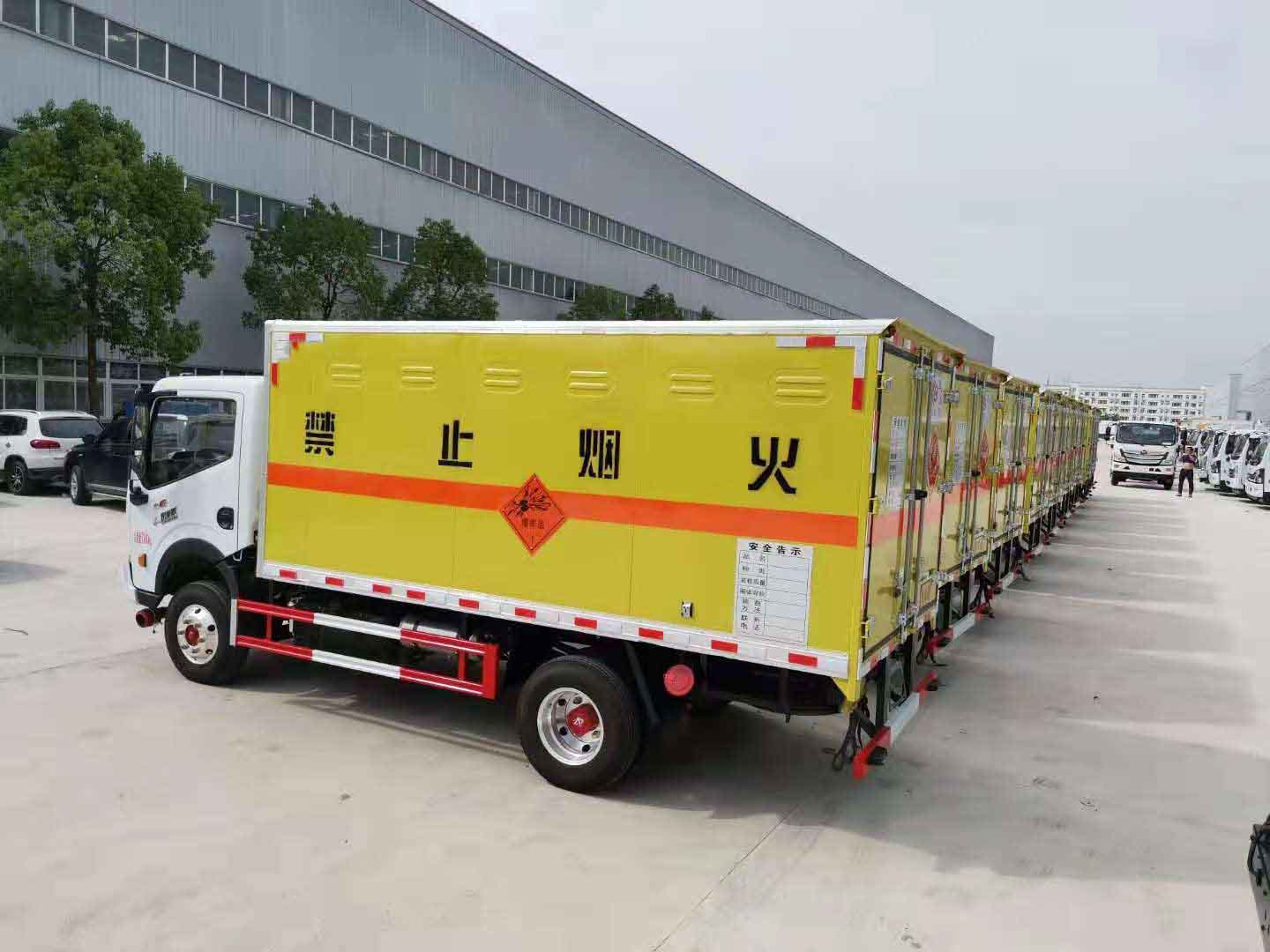 東風多利卡4米2爆破器材運輸車外板采用冷軋鋼板一次性沖壓成型的百葉窗,內飾為導電性能良好的鋁板有透氣孔,內襯為矩形管骨架牢靠穩定,骨架內部填充為透氣防潮阻燃的擠塑板。廂體外部四周鋁合金型材包邊,底板和車廂前下部鋪橡膠皮,后門雙開,右側選裝側開門,內部安裝固定貨物的臥環或腰欄,安裝煙霧報警器、防盜感應器。車身附件靜電接地帶、滅火器、防火罩、危險品三角燈、橙色反光帶、CCC反射器、菱形標志牌、危險品牌、安全告示齊全。
