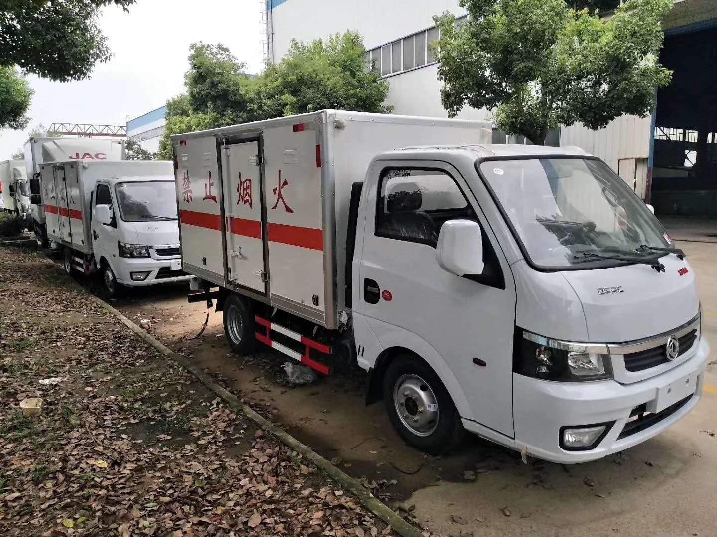 在車廂內頂部安裝感煙報警器,在門器框上方安裝有防盜報警器,廂體外側安裝示廓燈及滅火器支架,配置兩個滅火器,并有“嚴禁煙火”和“爆”等字樣,廂體周邊貼反光標識。后門貼有安全告示,危險品標牌。車輛尾部安裝兩條拖地導靜電膠帶,駕駛室頂部裝有安全三角燈。廂體顏色有:黃、白、灰色等可選; 現車僅為白色廂體,需要訂購的客戶與我司電話聯系!