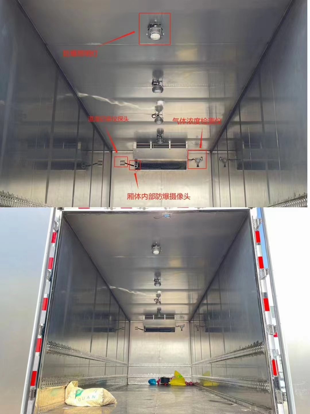 上裝配置:底板為花紋板、四周頂部加透氣孔,貨箱尺寸為:6800×2450×2400、外冷軋鋼板或碳鋼板制作、內鋁板、中間8mm厚保溫板、箱體為保溫冷藏設計箱體底稅鋪有1公分厚的防靜電膠皮、側板安裝2排固定貨物的臥環、箱內頂部安裝LED照明燈和煙霧報警器、防盜報警器、滅火器、駕駛室危險警示燈、防火帽、后雙開門,其它均按廠標執行組織生產;選用凱雪冷機,溫度可達-18度公告完全符合法規,無任何缺陷,冷機及尾板公告同時體現。
