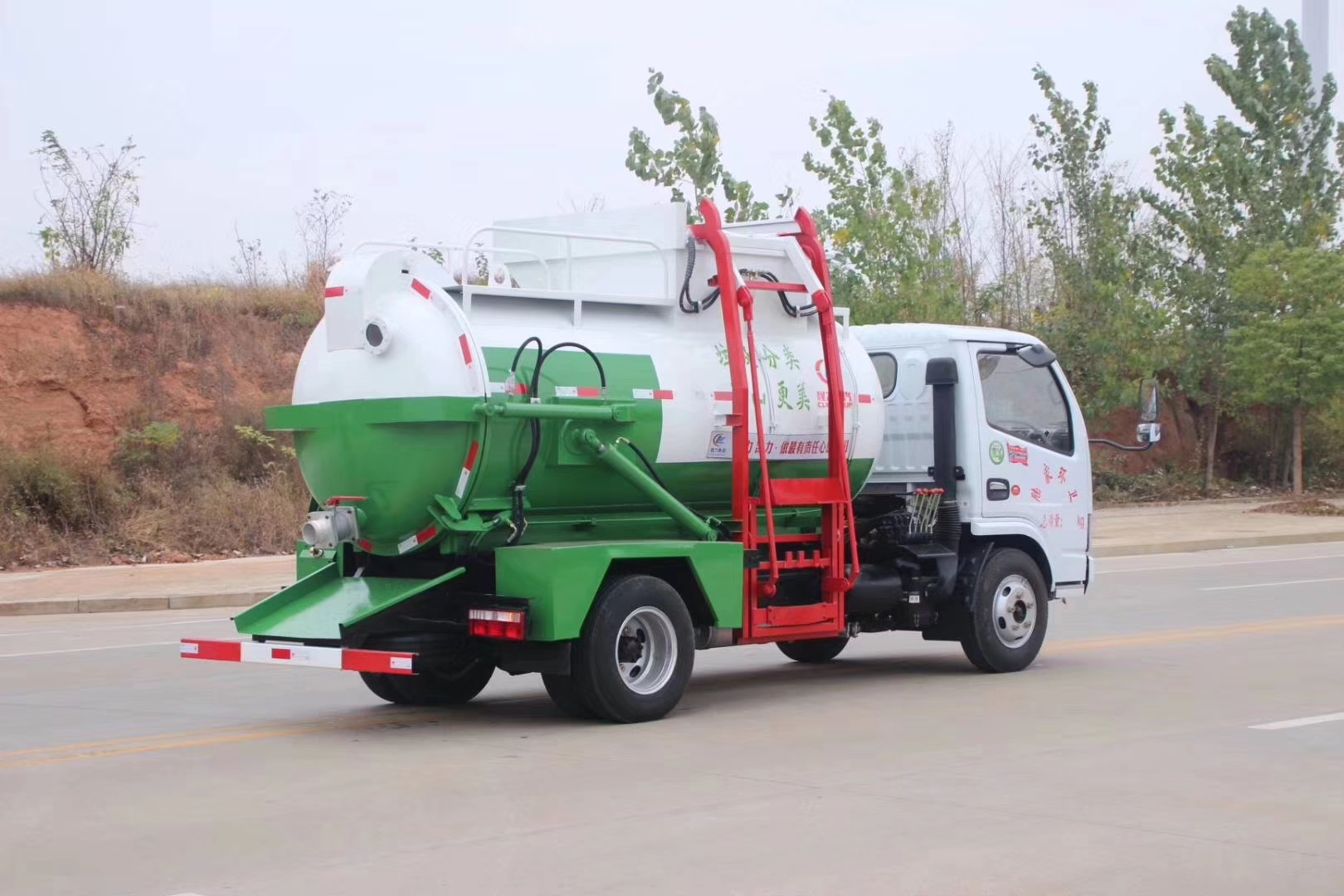 上裝配置: 罐體采用4mm優質鋼材制作,圓形罐體,罐體前后封頭采用圓弧蝶形封頭,罐體尾端及罐體后封頭外加25~30mm厚法蘭,罐體與后封頭上部采用鉸鏈連接,后封頭可利用液壓油缸打開卸料;罐體右側前部裝有掛桶提升機構裝卸桶裝垃圾,掛桶提升機前側裝有圓形液位計;罐體后部兩側安裝液壓油缸實現罐體舉升自卸,后蓋為液壓鎖緊 。