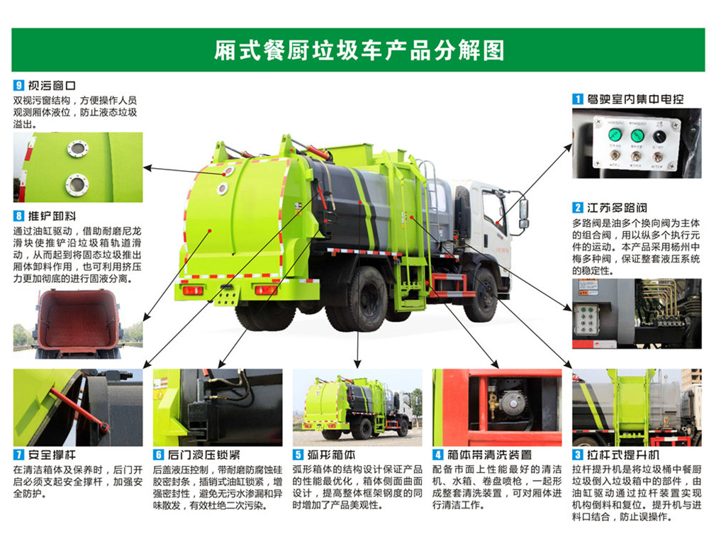 上裝配置: 弧形箱體(方罐),有效容積5立方,材質4mm,長源油泵,江蘇多路閥,國產液壓油缸,推鏟卸料(不帶舉升功能),具有干濕分離功能,液壓后蓋,后蓋帶密封條。后門液壓鎖緊,桿式提升機,可掛240L標準所料桶。駕駛室內集中電控(提升機外部手動控制),后門的鎖緊與后蓋開關的操作具有防誤操作,箱體帶清洗裝置(液壓馬達帶動高壓泵、帶水箱)。