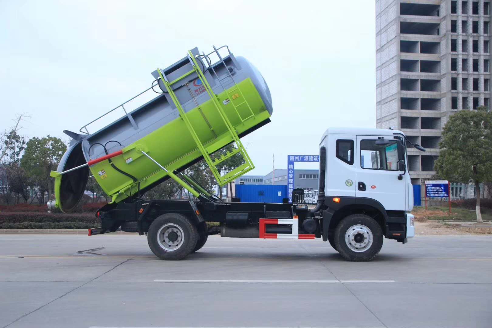 上裝配置: 罐體采用4mm優質鋼材制作,罐體容積8.5立方,圓形罐體,罐體前后封頭采用圓弧蝶形封頭,罐體尾端及罐體后封頭外加25~30mm厚法蘭,罐體與后封頭上部采用鉸鏈連接,后封頭可利用液壓油缸打開卸料;罐體右側前部裝有掛桶提升機構裝卸桶裝垃圾,掛桶提升機前側裝有圓形液位計;罐體后部兩側安裝液壓油缸實現罐體舉升自卸,后蓋為液壓鎖緊 。