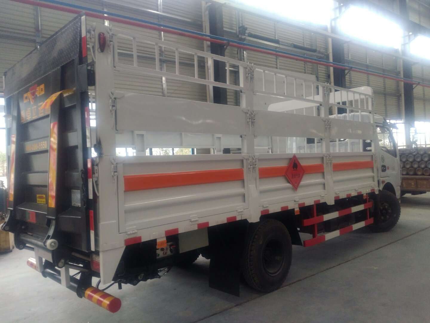 2)廂體配置:貨廂尺寸為4120X1840X60(mm)、邊板對(duì)折四開門、外板采用1.2MM厚冷軋板,內(nèi)襯為矩形管骨架牢靠穩(wěn)定,底板為3mm厚花紋板,有靜電帶、滅火器、防火罩,整車國(guó)標(biāo)反光標(biāo)示及警告標(biāo)志;