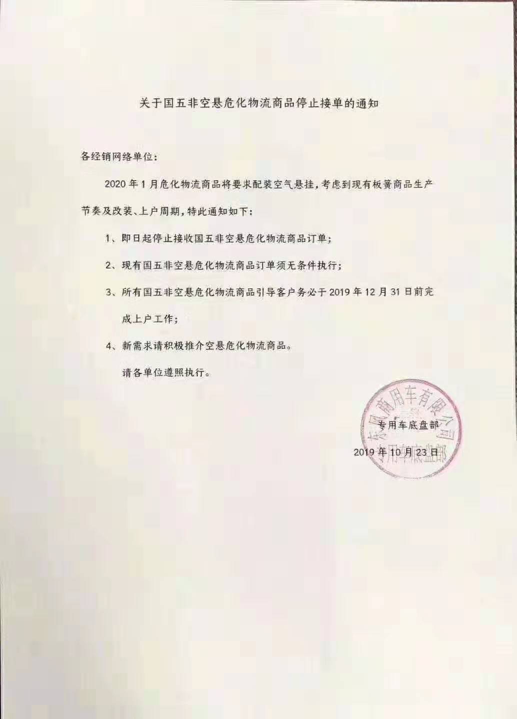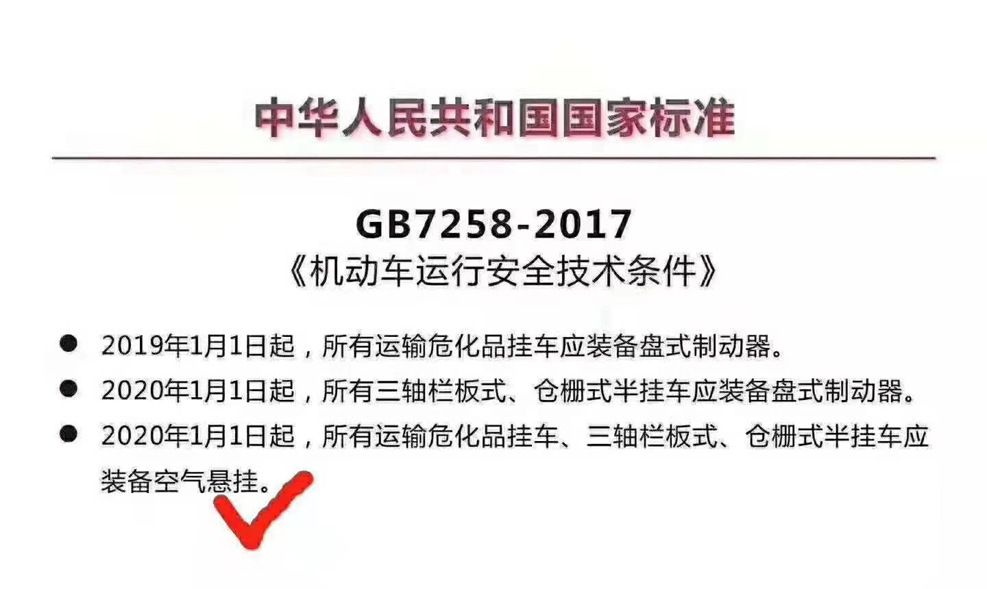 從2020年1月1日起,總質(zhì)量在12噸以上危險品車必須安裝空氣懸掛,東風(fēng)商用已停止接收危險品板簧底盤訂單,目前市場暫存少量此類底盤,加裝空氣懸掛單臺車輛成本至少增加三萬,政策實施后客戶購車成本會增加!需要購此類車型的客戶可提前進行預(yù)訂!再次提醒只為加深您的印象!在今年5月1日危險品車實行安全達標(biāo)時我們一一通知客戶,但仍有部分客戶未引起重視,后來政策實施后購車成本增加,客戶覺得后悔!希望各客戶酌情考慮!