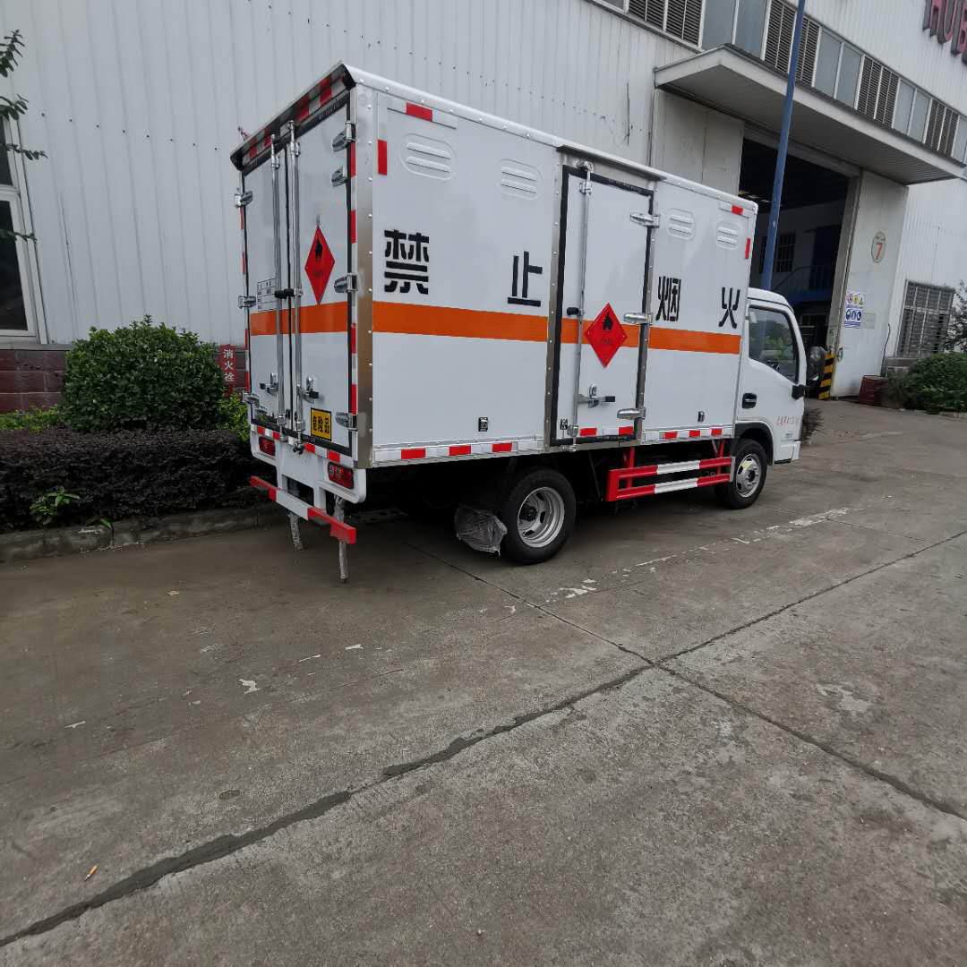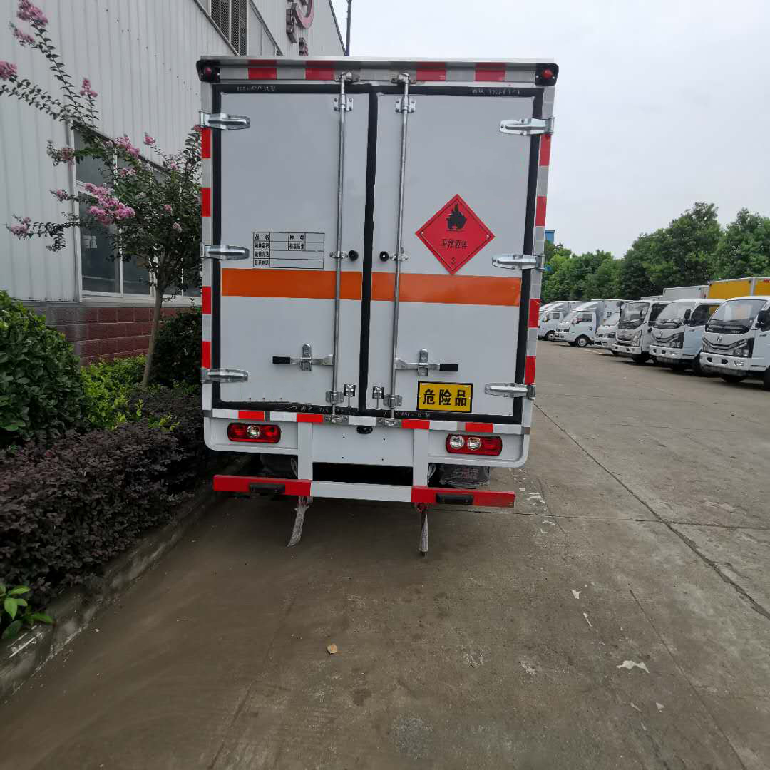 躍進柴油國六危險品車采用外飾冷軋鋼板,內飾鋁合金板,中間填充隔熱阻燃材料,(選裝側門和隔倉)廂體兩側上方設有防雨功能自然通風窗口,底部鋪有阻燃導靜電膠板,廂體側面裝有固定拉環,與捆綁帶使用捆綁貨物以避免移動。在車廂內頂部安裝感煙報警器,在門器框上方安裝有防盜報警器,廂體外側安裝示廓燈及滅火器支架,配置兩個滅火器,并有“嚴禁煙火”和“易燃氣體”等字樣,廂體周邊貼反光標識。后門貼有安全告示,危險品標牌。車輛尾部安裝兩條拖地導靜電膠帶,駕駛室頂部裝有安全三角燈。廂體顏色有:黃、白、灰色等可選。