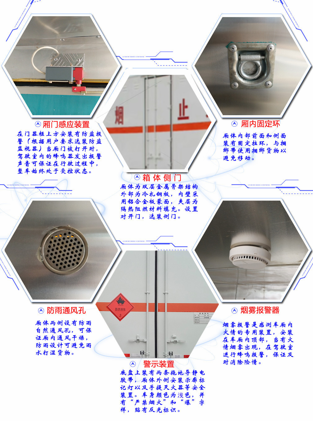 上裝配置:貨廂尺寸:6800×2450×2400(mm)。嚴格按照公告尺寸制作,外板采用1mm厚冷軋板有一次性成型的百葉窗,內飾為導電性能良好的鋁板有透氣孔,內襯為矩形管骨架牢靠穩定,內部填充為透氣防潮阻燃的擠塑板,四種材料經現代工藝復合而成,廂體外部上下鋁合金型材包邊,底板和車廂前下部鋪橡膠皮,后門雙開,右側中部雙開門,內部有固定貨物的臥環,車輛外部有靜電帶、滅火器、防火罩,車廂內安裝煙霧報警器和門防盜報警器,嚴格按照國家危險品相關法規張貼。