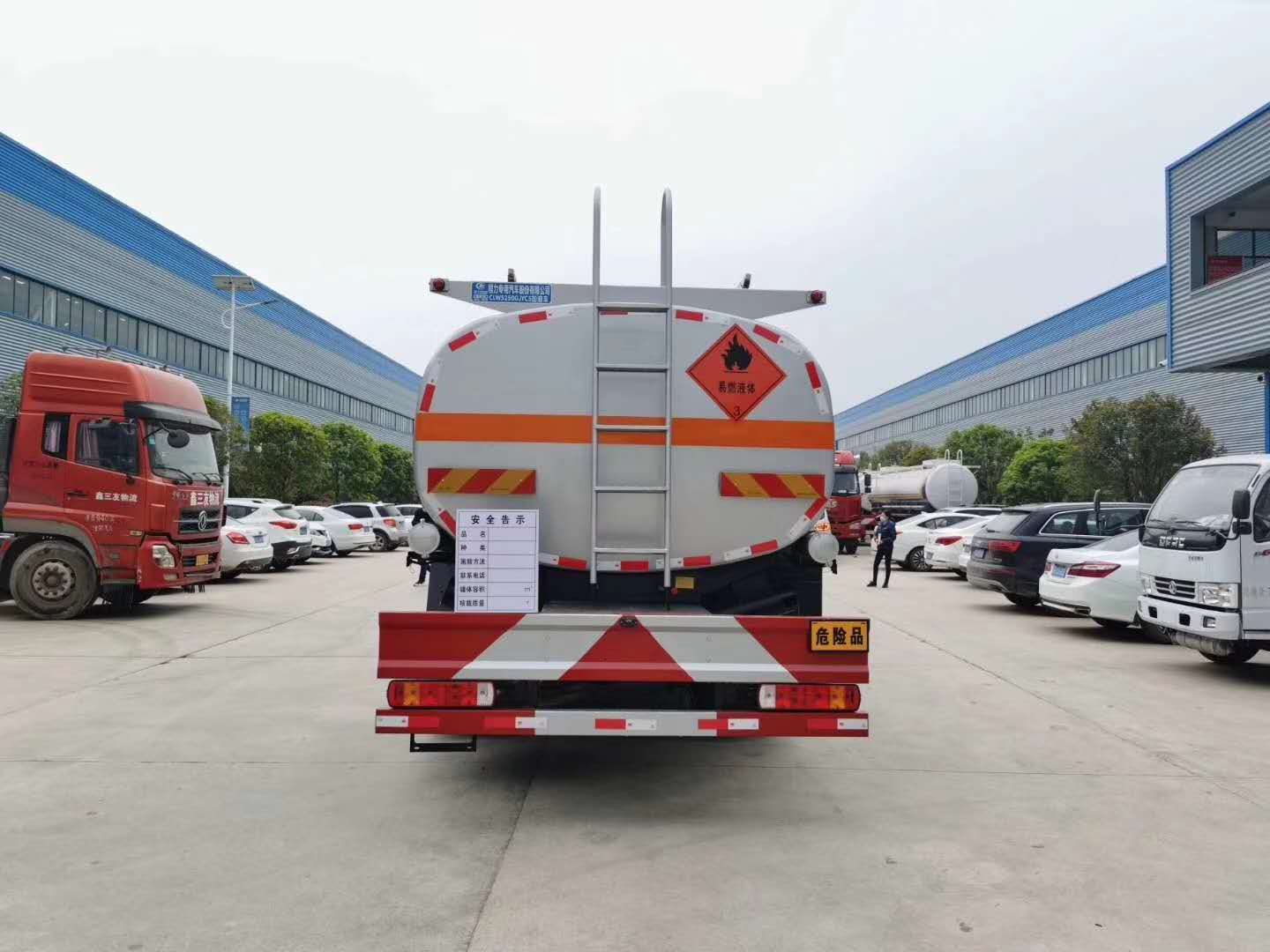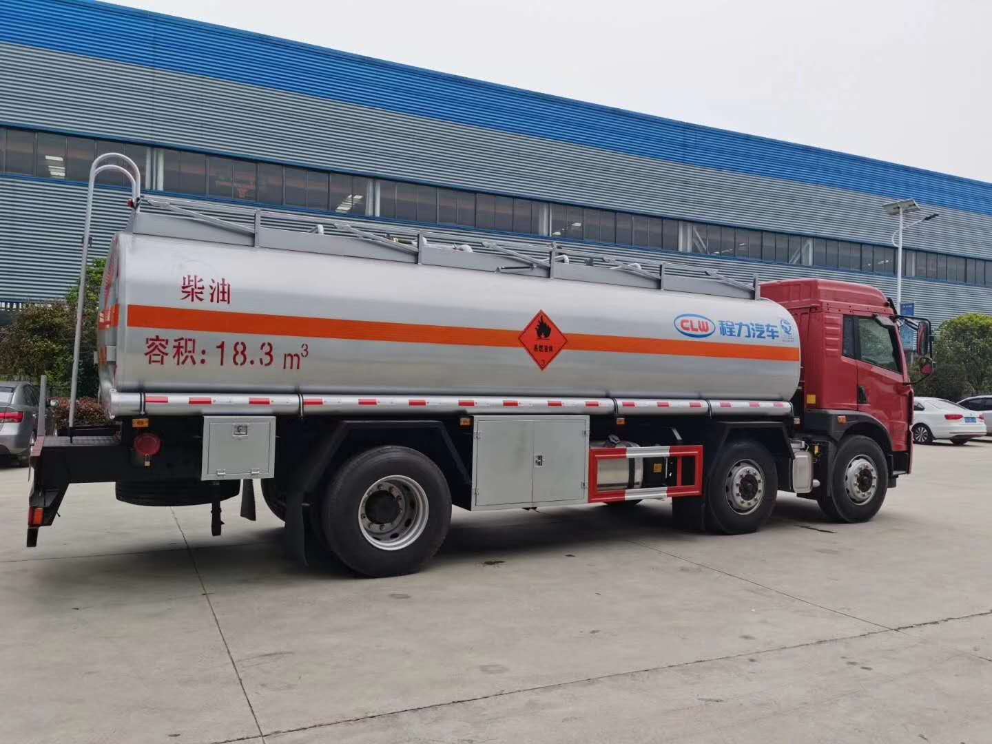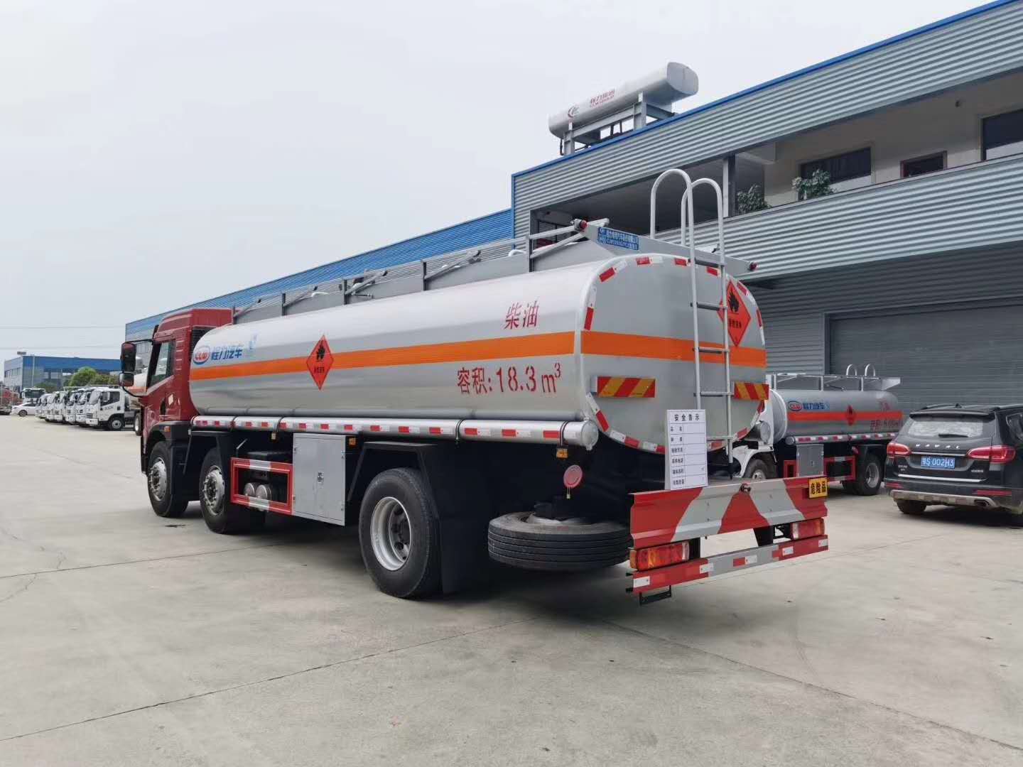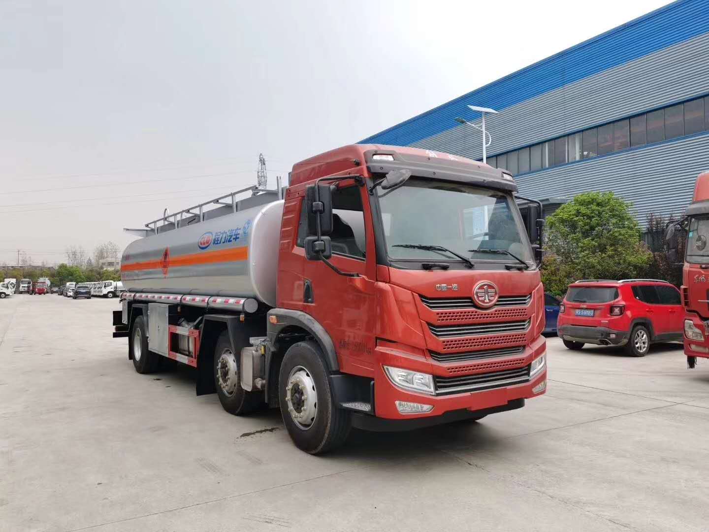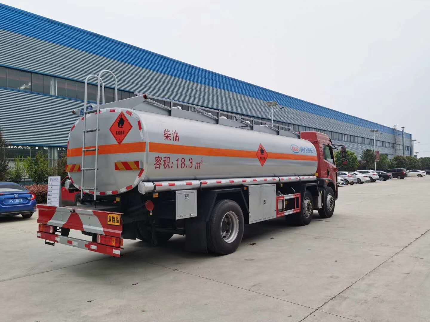 解放悍V小三軸22噸油罐車上裝公告罐體容積24.2立方,實際容積可做到26.1立方,可運輸21.7噸柴油或19噸汽油,罐體可選用采用鋁合金板材或碳鋼材質,筒體厚6mm,封頭厚7mm,標配1個歐標罐口,一個海底閥,一個專用油泵。一側工具箱帶泵進泵出,罐頂兩側帶有升降防護欄,防滑走道,罐內設有防浪板。