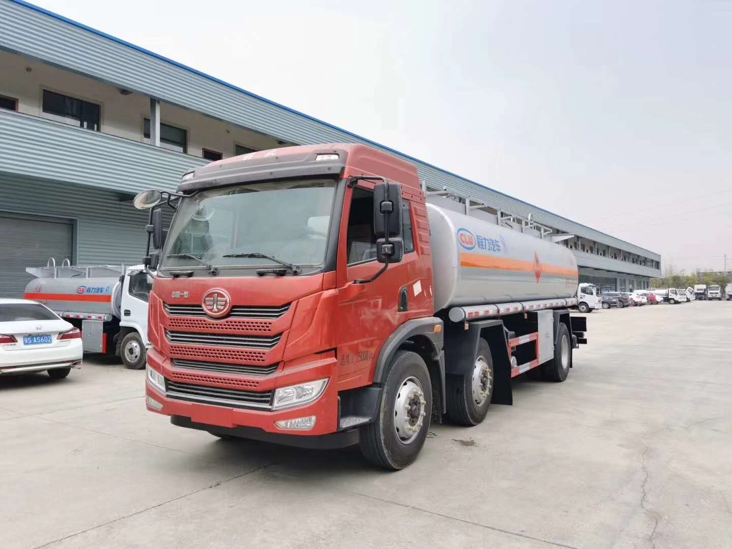 解放悍V小三軸22噸油罐車采用;穼S玫妆P,悍V排半駕駛室,錫柴220馬力發動機,國五排放標準,陜齒8檔變速箱,全車295真空胎,435后橋,帶原廠空調,方向助力,電動玻璃,氣囊座椅,ABS,斷氣剎制動系統,安裝前輪盤式制動器,限速裝置,限速80km/h,符合新法規,剎車帶自動調節臂,大燈調節功能,防飛濺裝置。