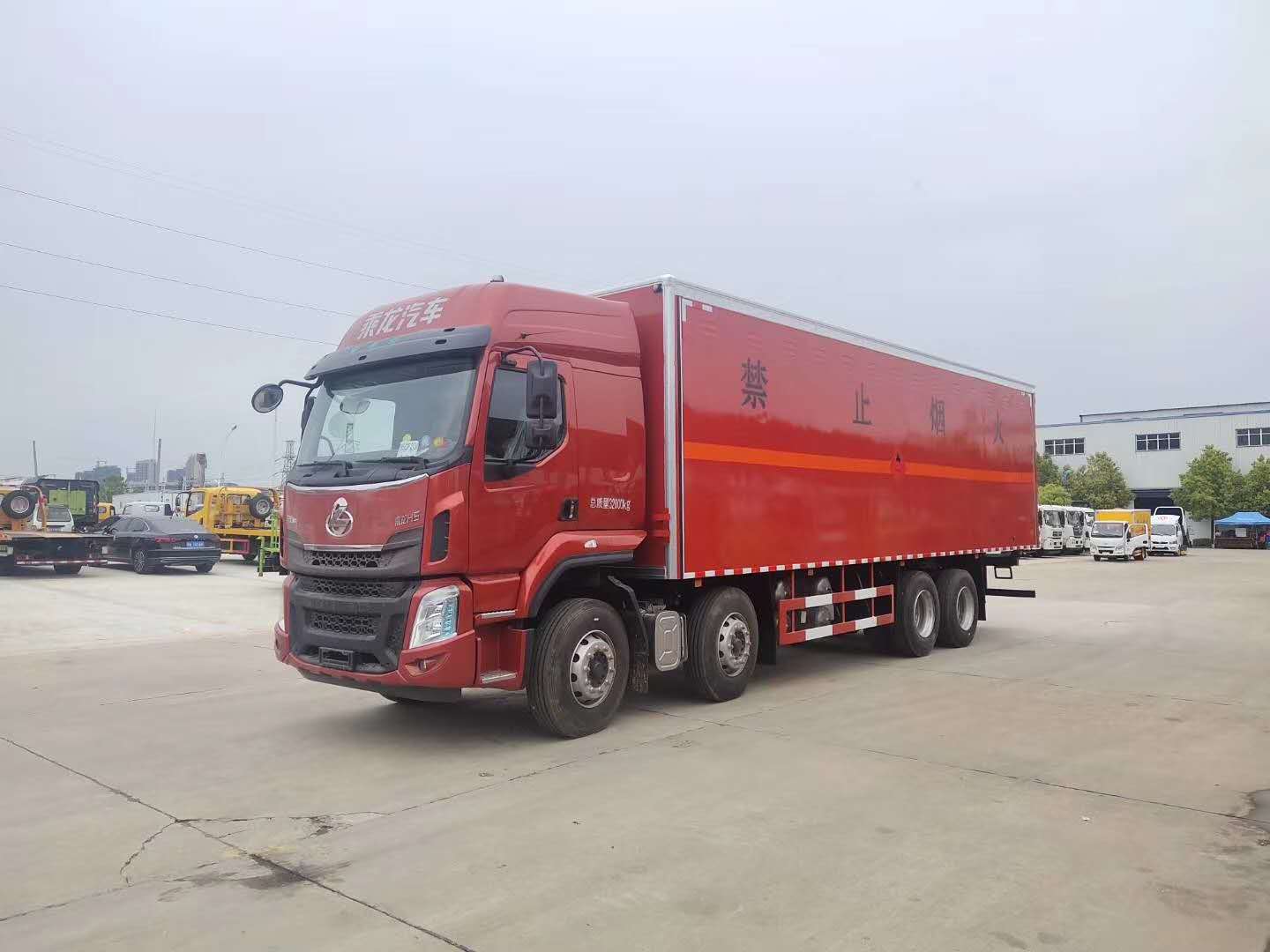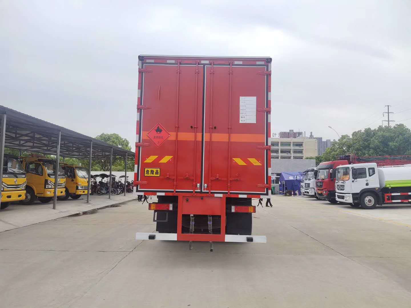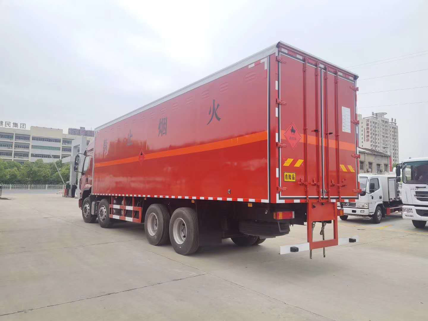 廂體配置:嚴格按照公告尺寸制作,外板采用1mm厚冷軋板有一次性成型的百葉窗,內飾為導電性能良好的鋁板有透氣孔,內襯為矩形管骨架牢靠穩定,內部填充為透氣防潮阻燃的擠塑板,四種材料經現代工藝復合而成,廂體外部上下鋁合金型材包邊,底板和車廂前下部鋪橡膠皮,后門雙開,右側中部兩個雙開門,內部有固定貨物的臥環,車輛外部有靜電帶、滅火器、防火罩,車廂內安裝煙霧報警器和門防盜報警器,嚴格按照國家危險品相關法規張貼。