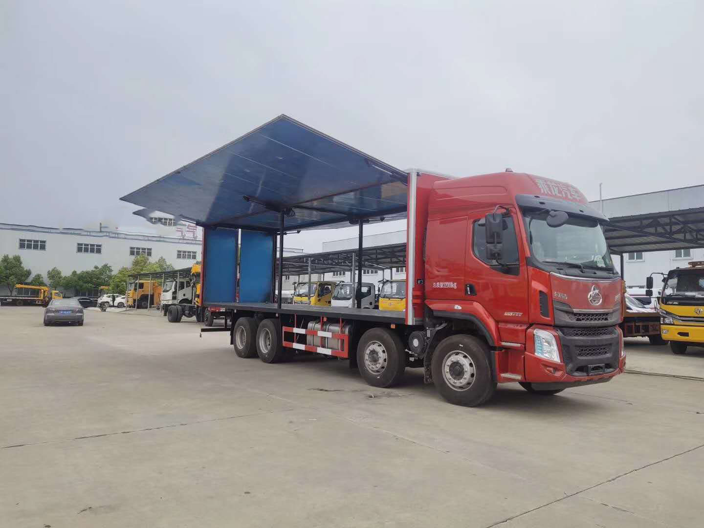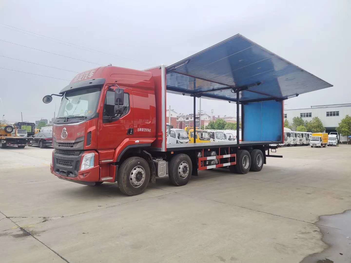 東風柳汽四軸易燃液體廂式車帶雙面翼展式,配6個液壓油缸。軸距1950+4100+1350mm,H57D駕駛室,YC6A290-50,9JS119TA,Ф430離合,FS160后橋/4.111,282(8)車架,600L鋁合金油箱,12R22.5,前機械后氣囊駕駛室懸置、電動液壓翻轉、夾層玻璃、電動玻璃升降器、氣囊減震司機座椅、鋁合金貯氣筒、LCD液晶儀表、MP3+收音機、空調、定速巡航系統、多態開關、電磁離合風扇、ABS、3/3/-/-后空懸、中控鎖、自動調整臂、車載終端(行駛記錄儀+兼容北斗GPS),盤式前橋,限速80km/h。