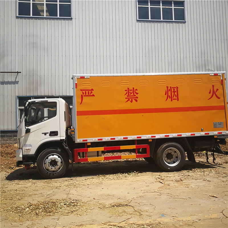 國六額載7噸福田奧鈴爆破器材運輸車廂體生產工藝采用可產生靜電屏蔽效應通風防雨的冷扎透氣鋼板,中間附以B1級阻燃擠塑板,內飾鋁合金板,廂內四周內飾采用鋁合金角鋁型材壓邊。廂內安裝固定運載物的臥環,防燃煙霧報警器,門上安裝防盜報警器,前置安裝防撞防靜電膠皮。廂體門框采用一次成形像膠密封條,底部為防爆鋼板上鋪靜電膠板。車廂配備防盜報警器,煙霧報警器,滅火器等。貨廂前后兩個示廓燈,排氣管尾端安裝排氣火花熄滅器,駕駛室安裝危險品三角標志燈,車聲側面及后部粘貼橙色反光標識,易燃氣體標示,車體后部設置危險標志牌。