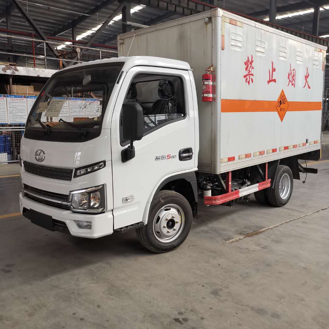 2)上裝配置:外飾冷軋鋼板,內飾鋁合金板,中間填充隔熱阻燃材料,(選裝側門和隔倉)廂體兩側上方設有防雨功能自然通風窗口,底部鋪有阻燃導靜電膠板,廂體側面裝有固定拉環,與捆綁帶使用捆綁貨物以避免移動。在車廂內頂部安裝感煙報警器,在門器框上方安裝有防盜報警器,廂體外側安裝示廓燈及滅火器支架,配置兩個滅火器,并有“嚴禁煙火”和“爆”等字樣,廂體周邊貼反光標識。后門貼有安全告示,危險品標牌。車輛尾部安裝兩條拖地導靜電膠帶,駕駛室頂部裝有安全三角燈。廂體顏色有:黃、白、灰色等可選。