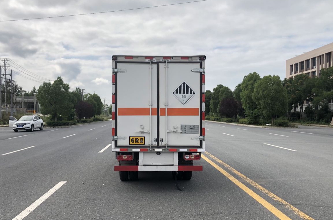 躍進S80國六雜項危險品車廂體材質為外飾冷軋鋼板、內飾鋁合金板、中間填充隔熱阻燃材料,選裝側門和隔倉,廂體兩側上方設有防雨功能自然通風窗口,底部鋪有阻燃導靜電膠板,廂體側面裝有固定拉環,與捆綁帶使用捆綁貨物以避免移動。在車廂內頂部安裝感煙報警器,在門器框上方安裝有防盜報警器,廂體外側安裝示廓燈及滅火器支架,配置兩個滅火器,并有“嚴禁煙火”和“爆”等字樣,廂體周邊貼反光標識。后門貼有安全告示,危險品標牌。車輛尾部副梁安裝兩條拖地導靜電帶,駕駛室頂部裝有安全三角燈。廂體顏色可定制:黃、白、灰色等。