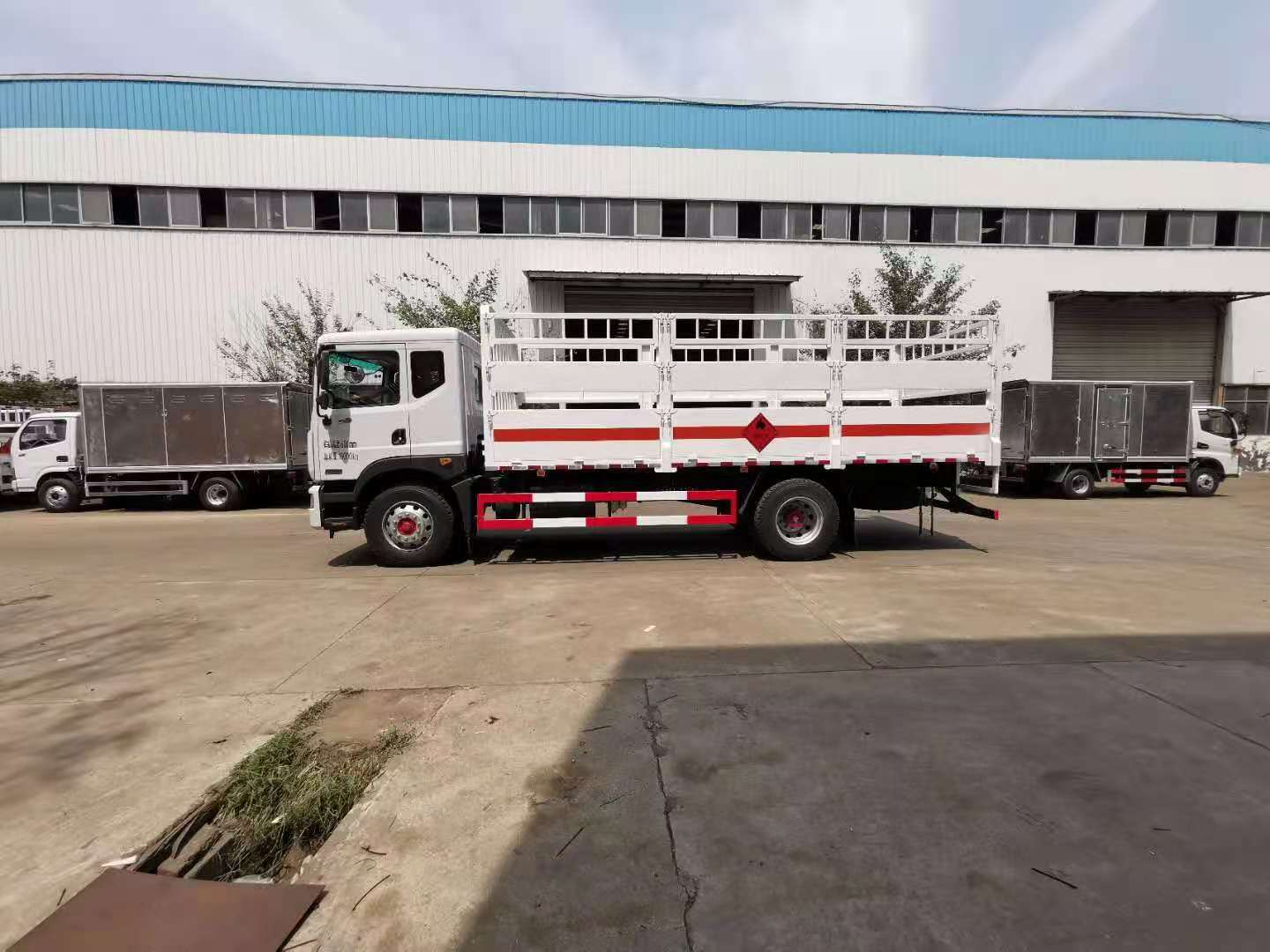 東風D9國六氣瓶運輸車采用欄板車結構,外厚度為1.1毫米厚度武鋼冷軋鋼板(或沖壓成瓦楞板,以公告為準),內加強“幾”字型加強梁,車體底板加強處理并做防靜電處理。車體的左側、右側,和后欄板栓鉤結構,可向下打開,方便上下貨物,車體為密封廂式車型,大大減少了運輸物品因為狹窄空和強烈碰撞產生氣瓶爆炸的危險性,箱體外觀涂裝白色油漆,在欄板的中間位置粘貼橙色的危化車標帶,并在車體的左、右、后部粘貼“易燃氣體”字標識。駕駛室內部配備兩只滅火器,后保險杠處安裝防追尾事故的緩沖固定塊。此款車輛屬于國家規定的危險品二類危險品運輸車。