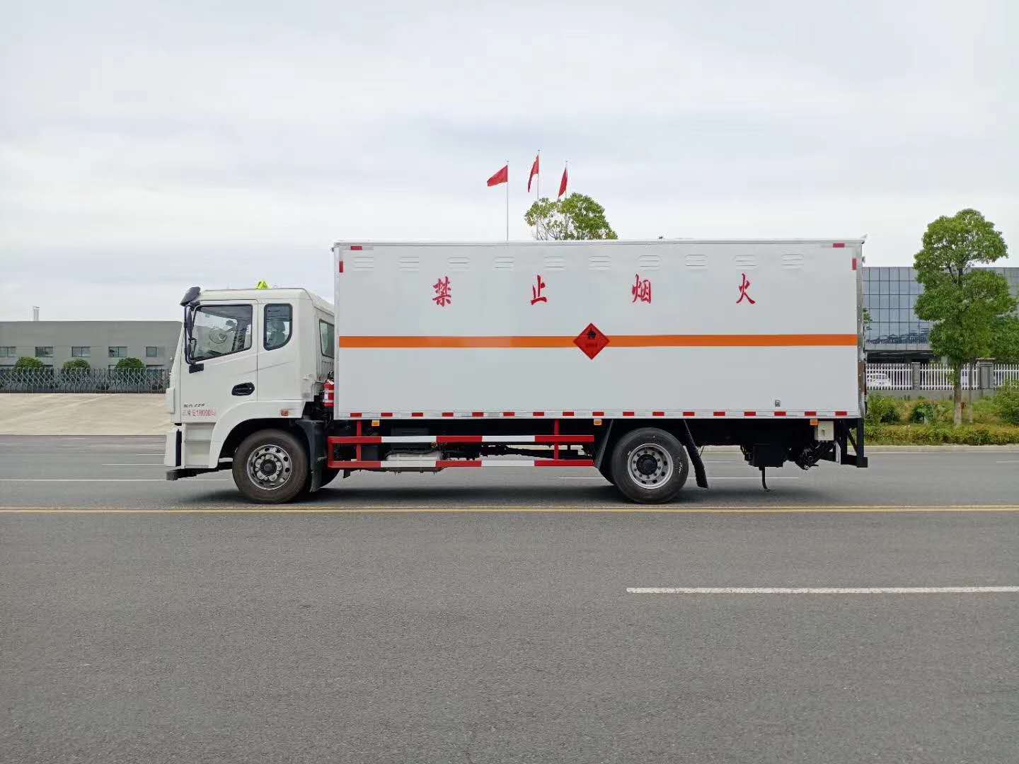 5)上裝配置:廂體為雙層金屬骨架結構,外板冷軋板,中間填充阻燃泡沫,內壁采用鋁合金蒙面,并用鋁合金型材收邊,門框采用不銹鋼材質包邊,鍍鋅合頁、門桿、鎖件,廂體兩側上部安裝防雨通風透氣孔。底板為花紋板,上鋪防靜電膠皮,廂體右側中開單側門。廂內兩側加裝固定貨物臥環,門框帶防盜報警器,頂部帶煙霧報警器,防撞塊。配備隨車工具,滅火器,三角頂燈,防火帽,防靜電拖帶,貼反光標識等。