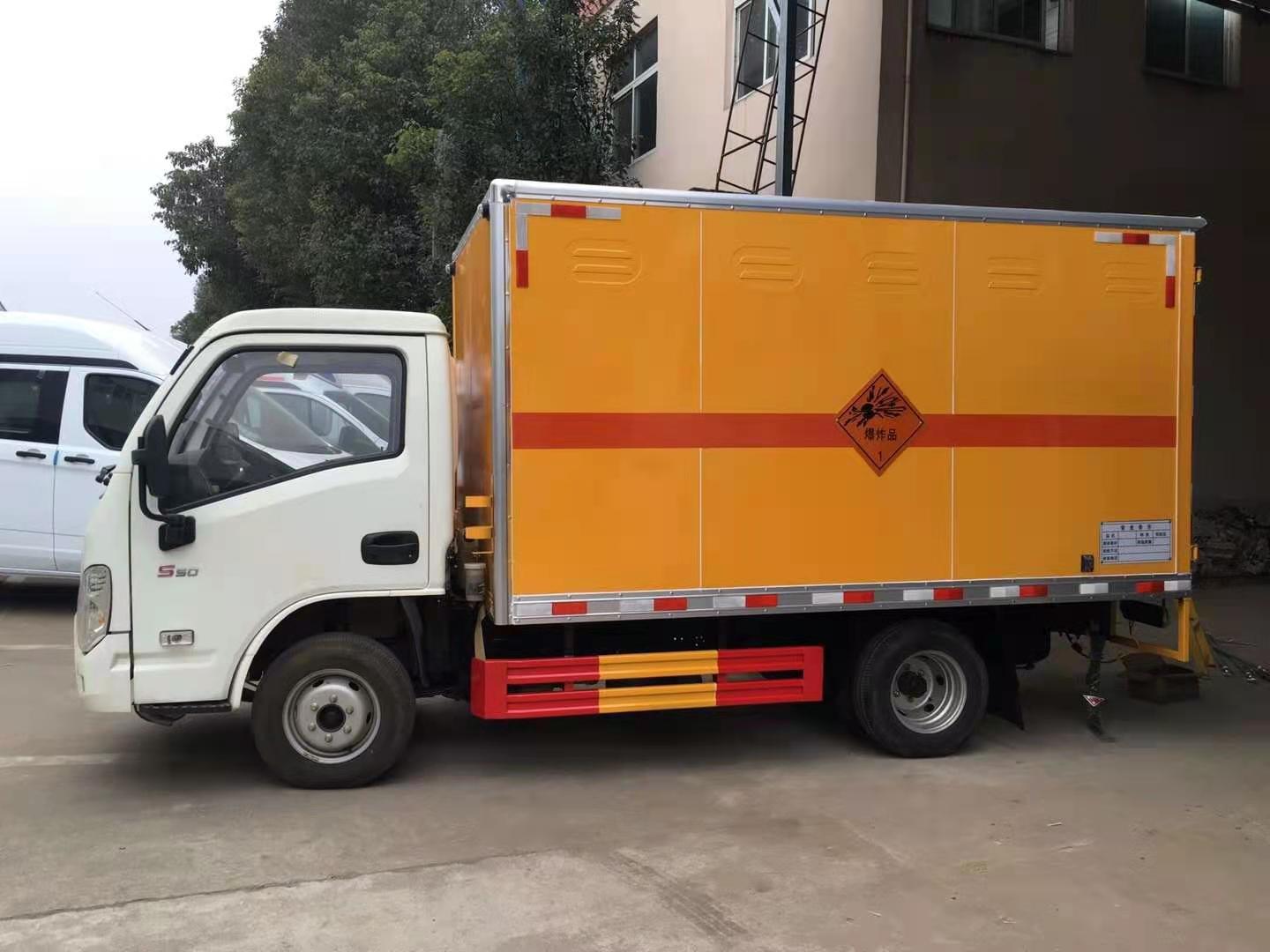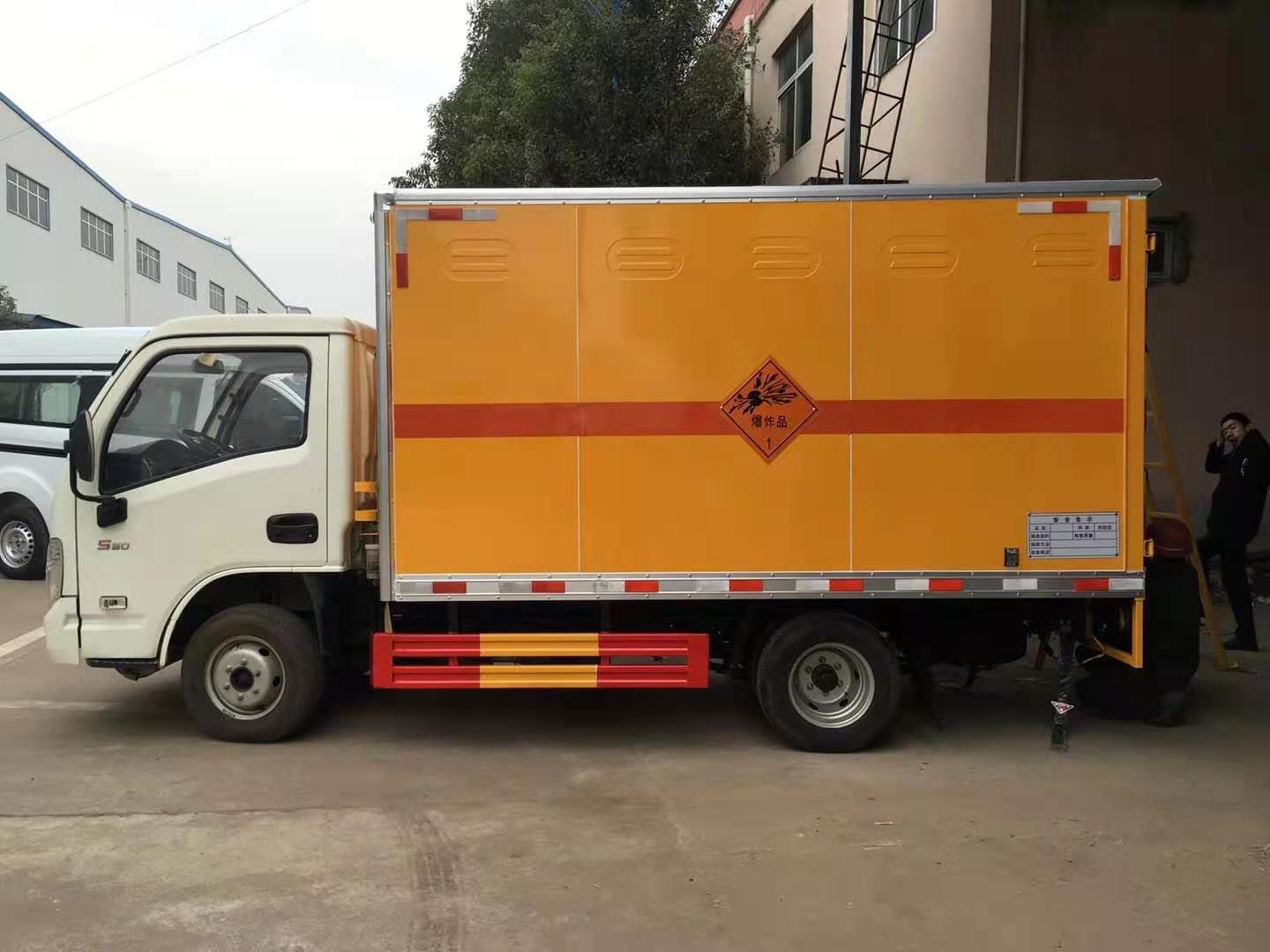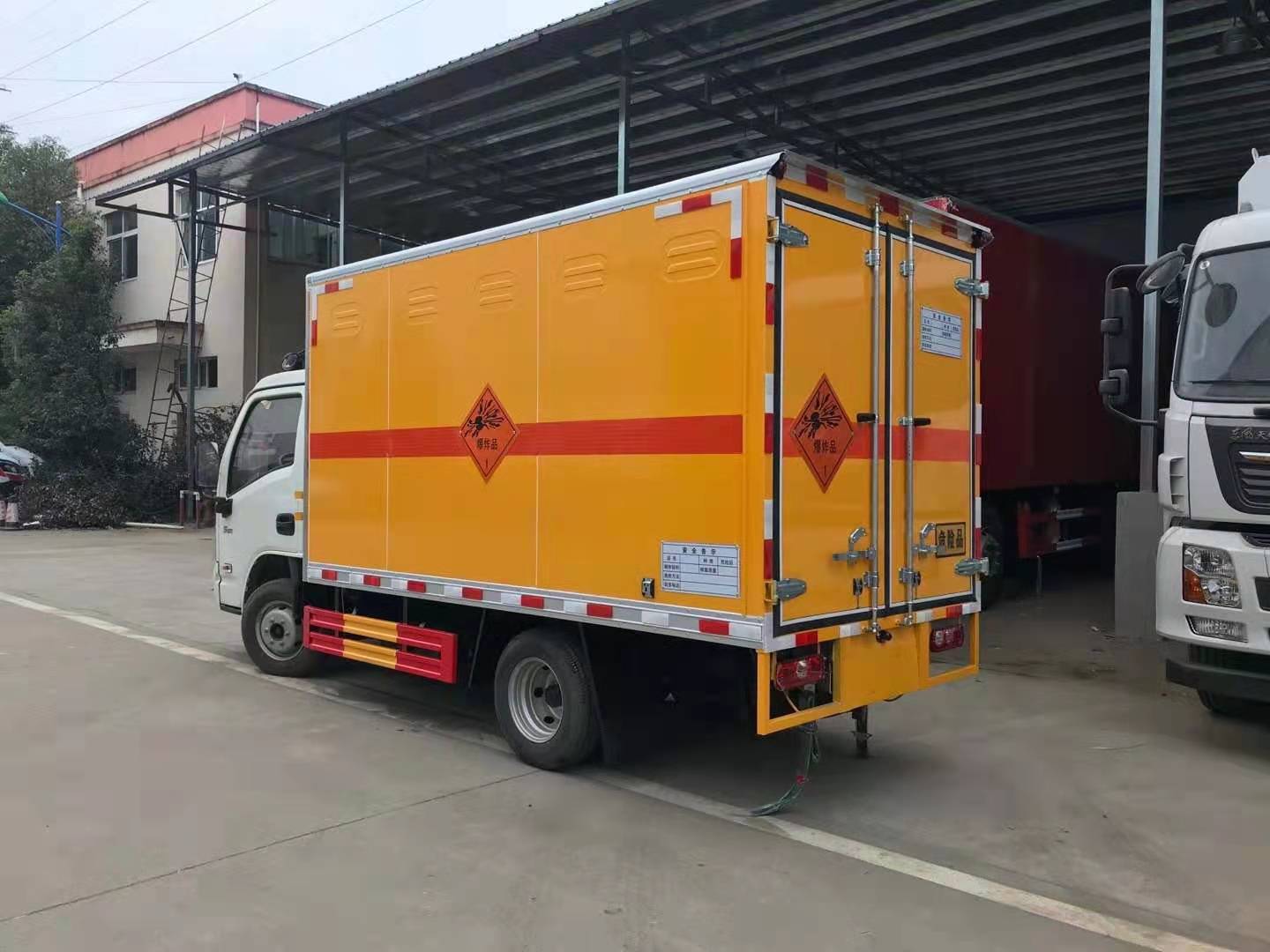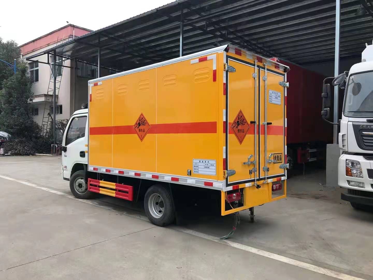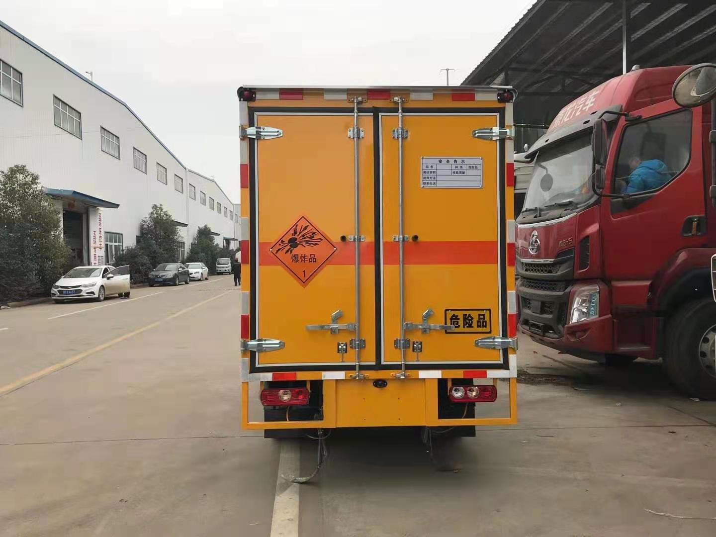 躍進S80帶隔艙國六防爆車廂體采用外飾冷軋鋼板,內飾鋁合金板,中間填充隔熱阻燃材料,(選裝側門和隔倉)廂體兩側上方設有防雨功能自然通風窗口,底部鋪有阻燃導靜電膠板,廂體側面裝有固定拉環,與捆綁帶使用捆綁貨物以避免移動。在車廂內頂部安裝感煙報警器,在門器框上方安裝有防盜報警器,廂體外側安裝示廓燈及滅火器支架,配置兩個滅火器,并有“嚴禁煙火”和“爆”等字樣,廂體周邊貼反光標識。后門貼有安全告示,危險品標牌。車輛尾部安裝兩條拖地導靜電膠帶,駕駛室頂部裝有安全三角燈。廂體顏色有:黃、白、灰色等可選。