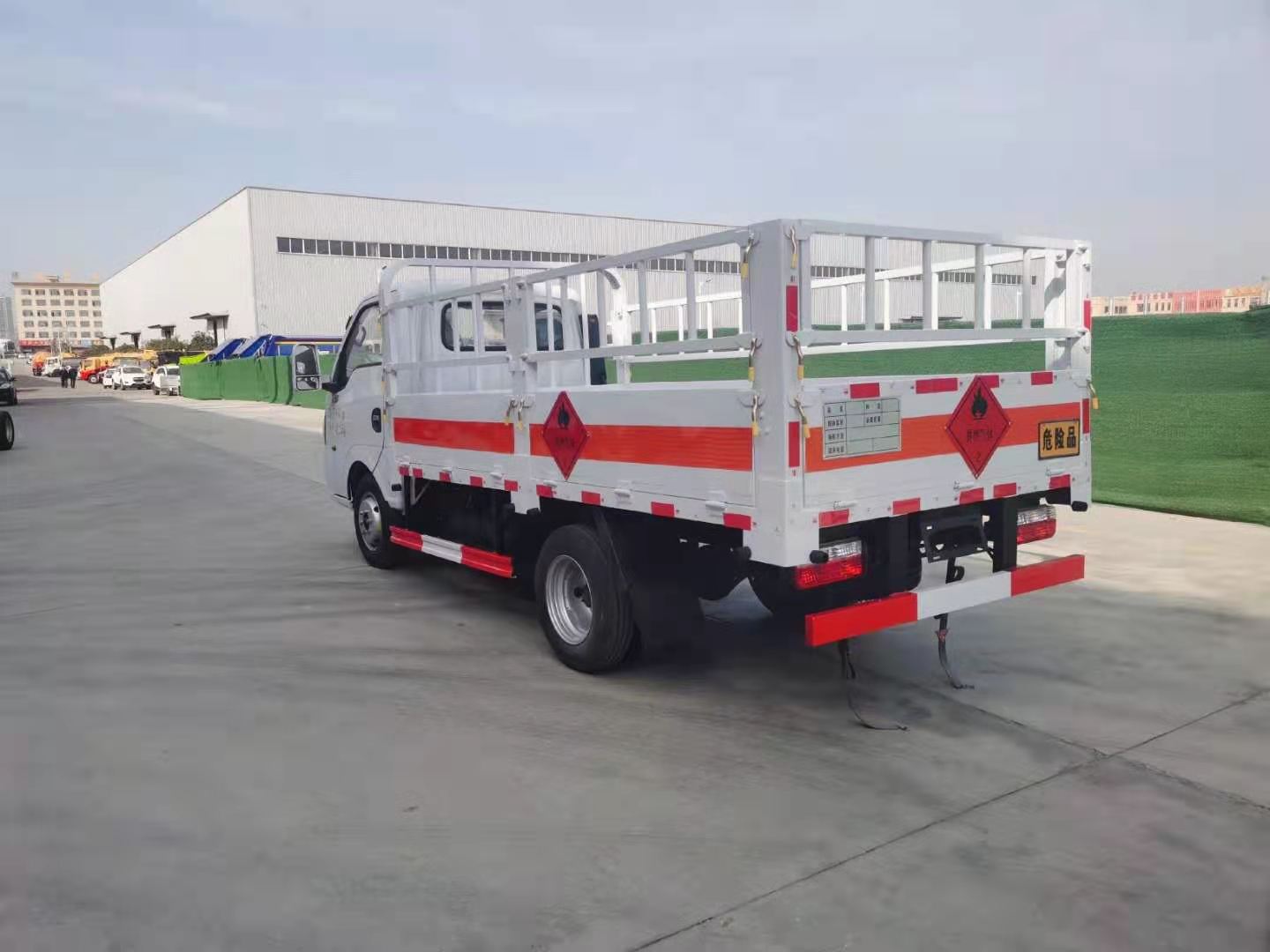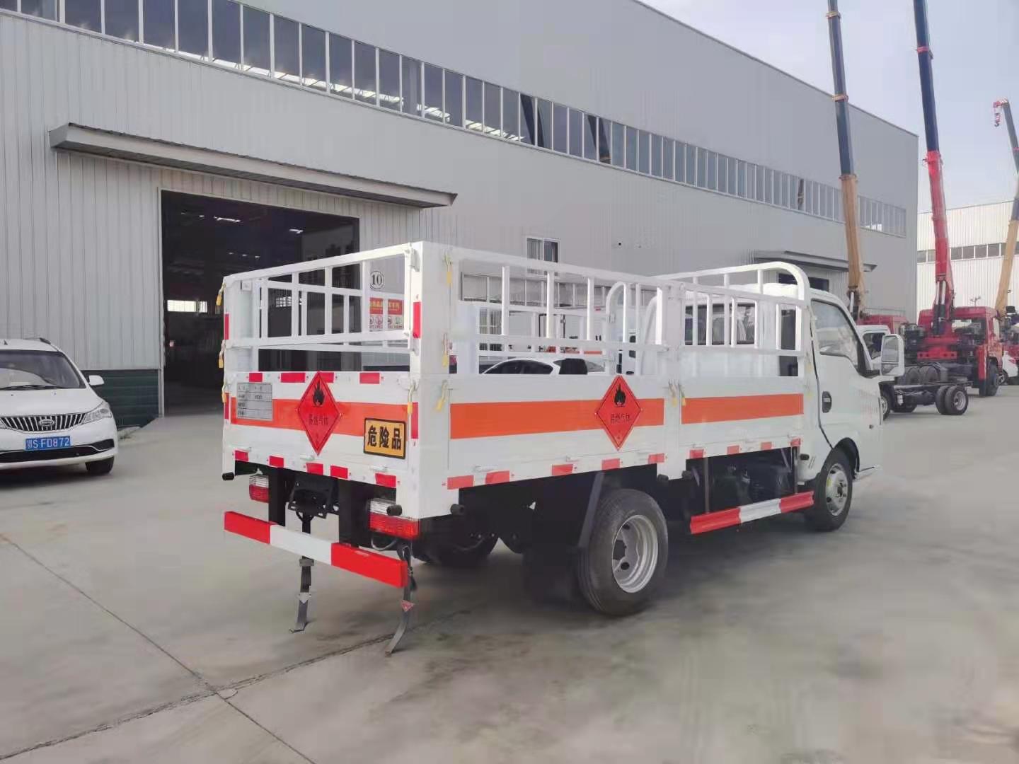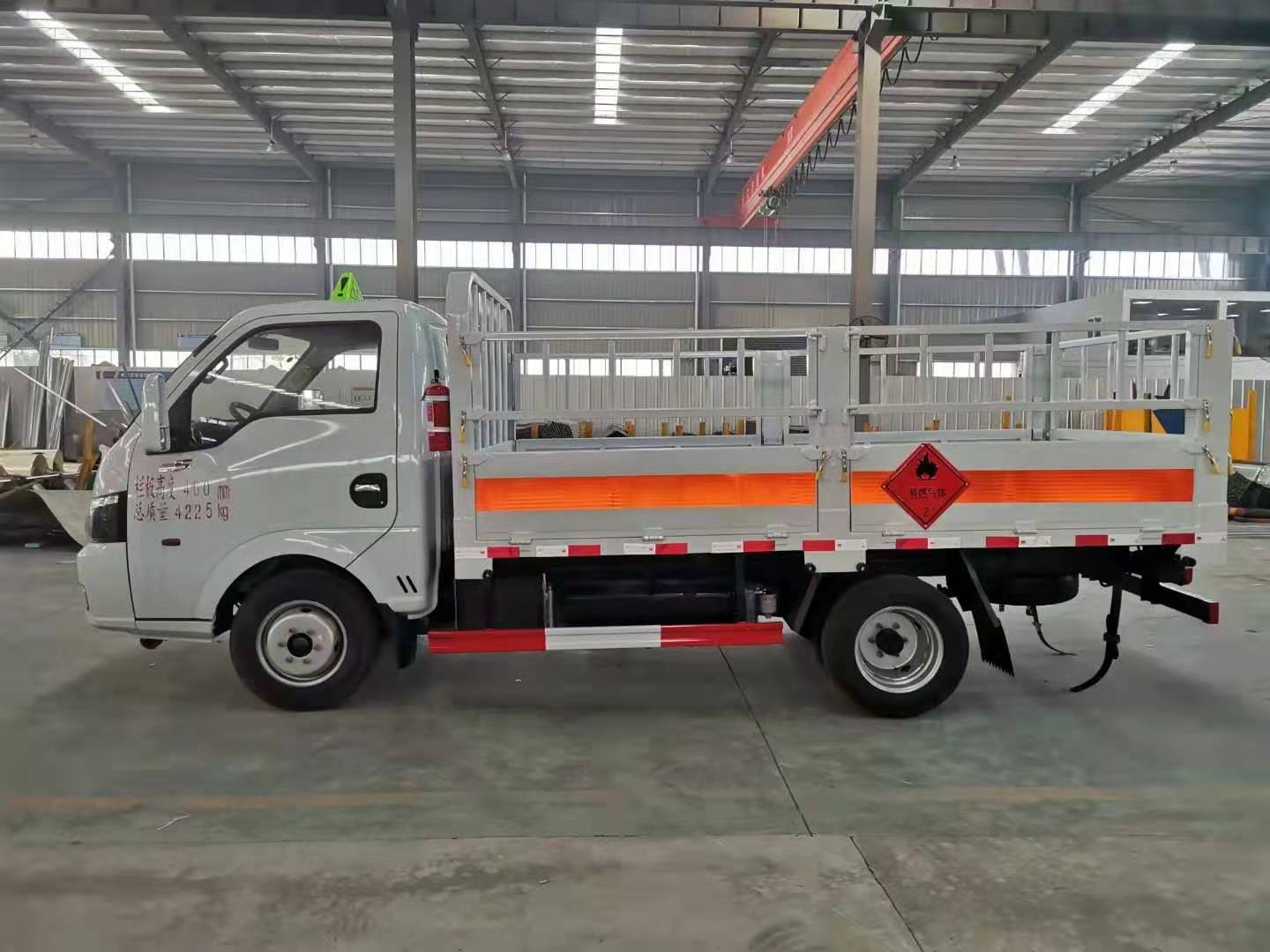 國(guó)六東風(fēng)途逸柴油氣瓶車箱體采用廂式欄板車結(jié)構(gòu),外厚度為1.1毫米厚度武鋼冷軋鋼板(或沖壓成瓦楞板,以公告為準(zhǔn)),內(nèi)加強(qiáng)“幾”字型加強(qiáng)梁,車體底板加強(qiáng)處理并做防靜電處理。車體的左側(cè)、右側(cè),和后欄板栓鉤結(jié)構(gòu),可向下打開,方便上下貨物,車體為空曠式車型,大大減少了運(yùn)輸物品因?yàn)楠M窄空和強(qiáng)烈碰撞產(chǎn)生氣瓶爆炸的危險(xiǎn)性,箱體外觀涂裝白色油漆,在欄板的中間位置粘貼橙色的危化車標(biāo)帶,并在車體的左、右、后部粘貼“易燃?xì)怏w”或“不燃?xì)怏w”標(biāo)識(shí)。駕駛室內(nèi)部配備兩只滅火器,后保險(xiǎn)杠處安裝防追尾事故的緩沖固定塊。此款車輛屬于國(guó)家規(guī)定的危險(xiǎn)品二類倉(cāng)欄式運(yùn)輸車。廂體內(nèi)部有固定貨物的臥環(huán),車輛外部有靜電帶、滅火器、防火罩,車廂內(nèi)安裝煙霧報(bào)警器和門防盜報(bào)警器,嚴(yán)格按照國(guó)家危險(xiǎn)品相關(guān)法規(guī)張貼。