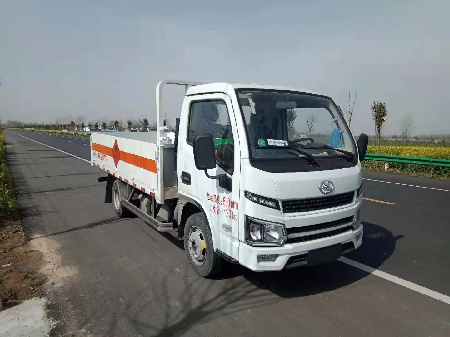躍進柴油3.65米低欄板氣瓶運輸車廂體邊板為平板可活動,邊板為雙層鐵皮,廂體內(nèi)部安裝便于可固定貨物的卡槽,上部帶花籃(可拆卸),中部立柱,立柱為活動式,底板為3mm鋼板上面鋪防靜電膠皮,靜電拖地帶,滅火器兩個,危險品三角頂燈,防火帽,廂體顏色白色,其他嚴格按公告制作。