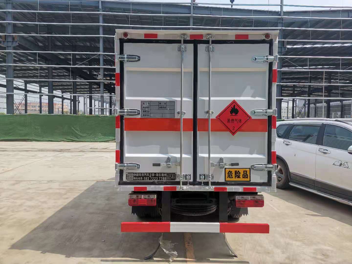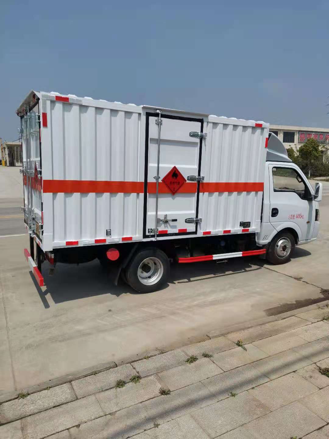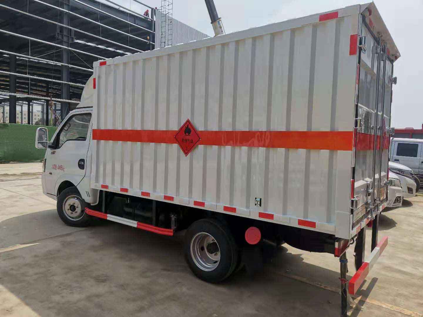 東風途逸國六瓦楞板危險品車廂體材質(zhì)為瓦楞廂體,底部鋪有阻燃導靜電膠板,廂體側(cè)面裝有固定拉環(huán)。在車廂內(nèi)頂部安裝感煙報警器,在門器框上方安裝有防盜報警器,廂體外側(cè)安裝示廓燈及滅火器支架,配置兩個滅火器,并有“嚴禁煙火”和“易燃氣體”等字樣,廂體周邊貼反光標識。后門貼有安全告示,危險品標牌。車輛尾部副梁安裝兩條拖地導靜電帶,駕駛室頂部裝有安全三角燈。廂體顏色可定制:黃、白、灰色等。