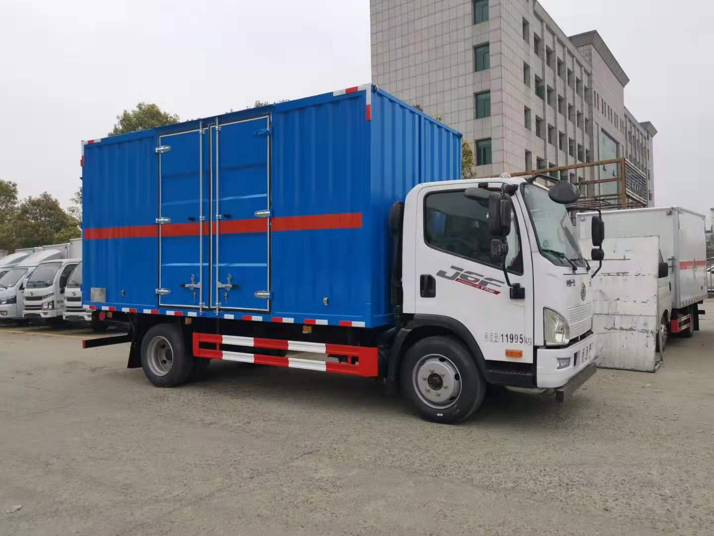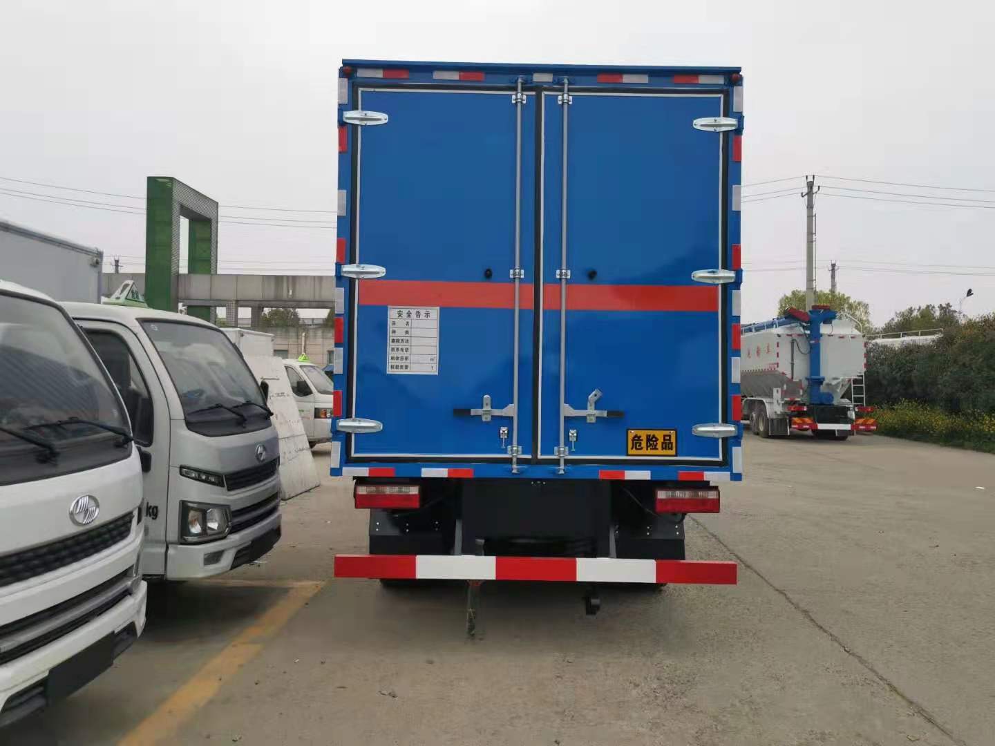解放J6F國六5米1藍色危險品車廂體為瓦楞廂體,嚴格按照公告尺寸制作,外板采用1mm厚冷軋板有一次性成型的百葉窗,廂體外部上下鋁合金型材包邊,底板和車廂前下部鋪橡膠皮,后門雙開,右側中部兩個雙開門,內部有固定貨物的臥環,車輛外部有靜電帶、滅火器、防火罩,車廂內安裝煙霧報警器和門防盜報警器,嚴格按照國家危險品相關法規張貼。