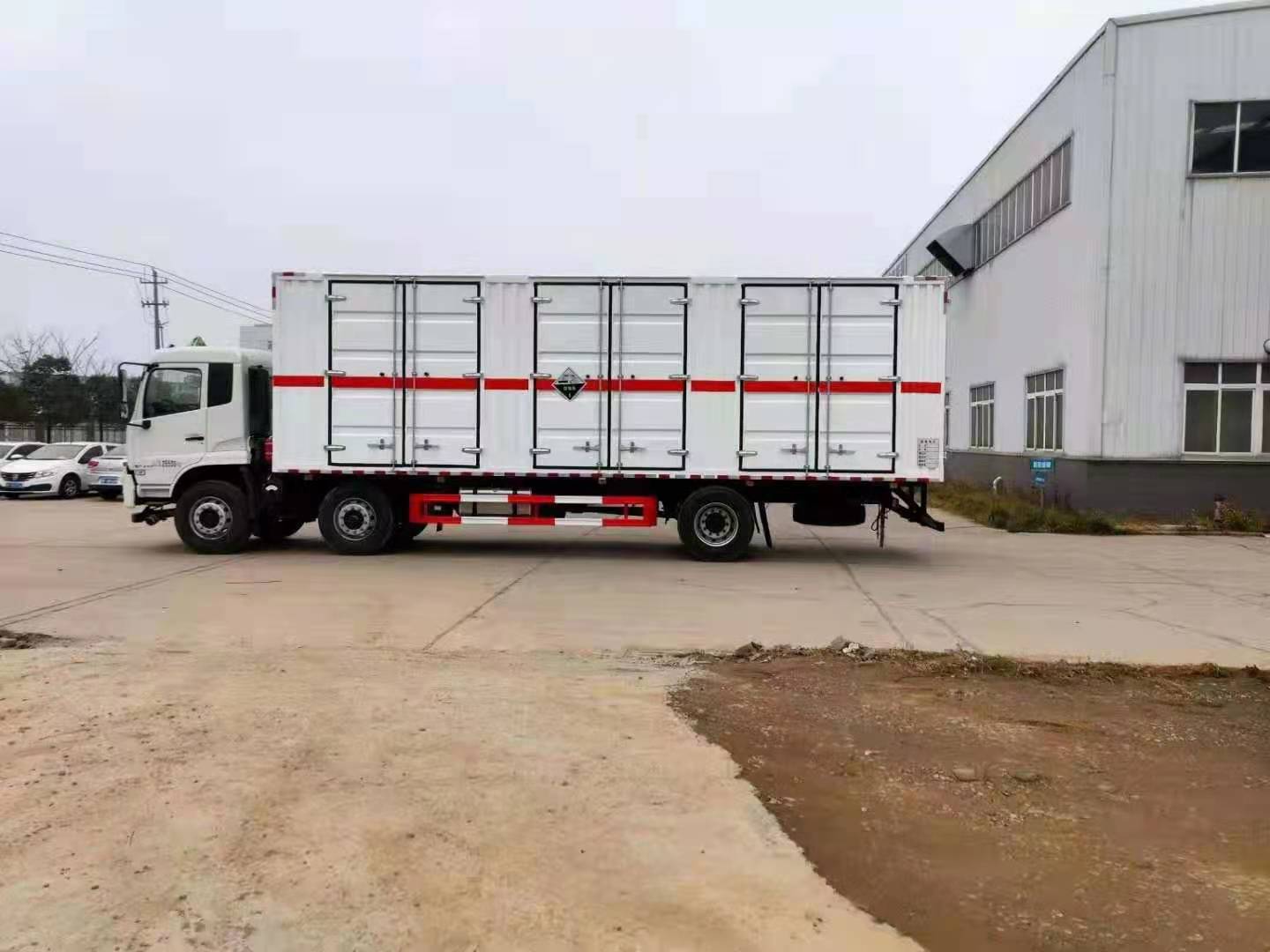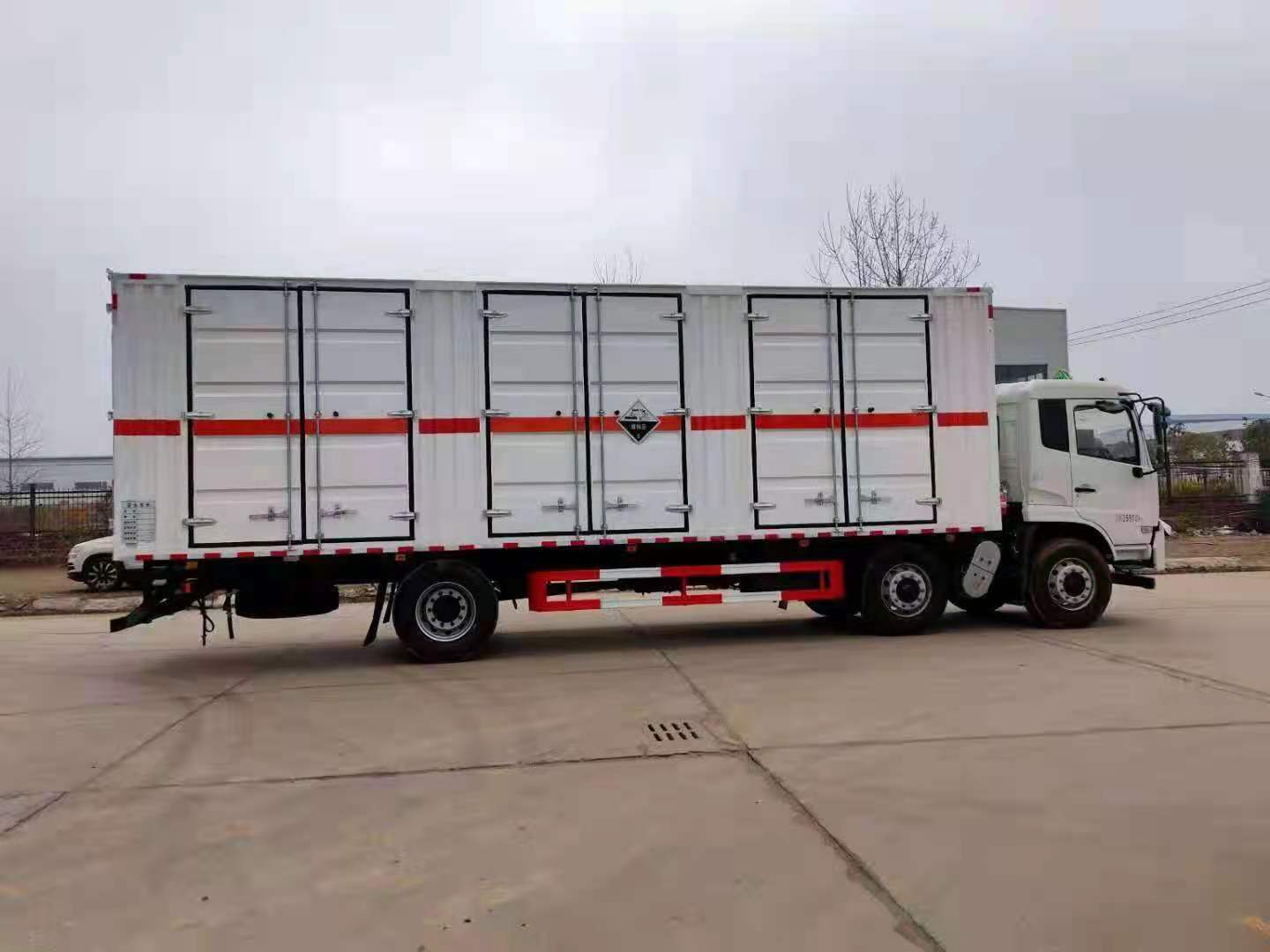 東風天錦小三軸國六新規危險品車廂體為雙層金屬骨架結構,外冷軋鋼板內飾鋁板,內壁采用鋁合金板蒙面,夾層為隔熱阻燃材料填充,廂體內部做通風窗口,中開側門,廂體內部做防靜電處理,廂體底部鋪導靜電膠板,車輛副梁配備導靜電帶,廂體內襯壁裝單排臥環,廂體內頂部安裝煙感報警器,廂體安裝防盜報警器。隨車配備手提滅火器,危險品三角頂燈,防護帽等。