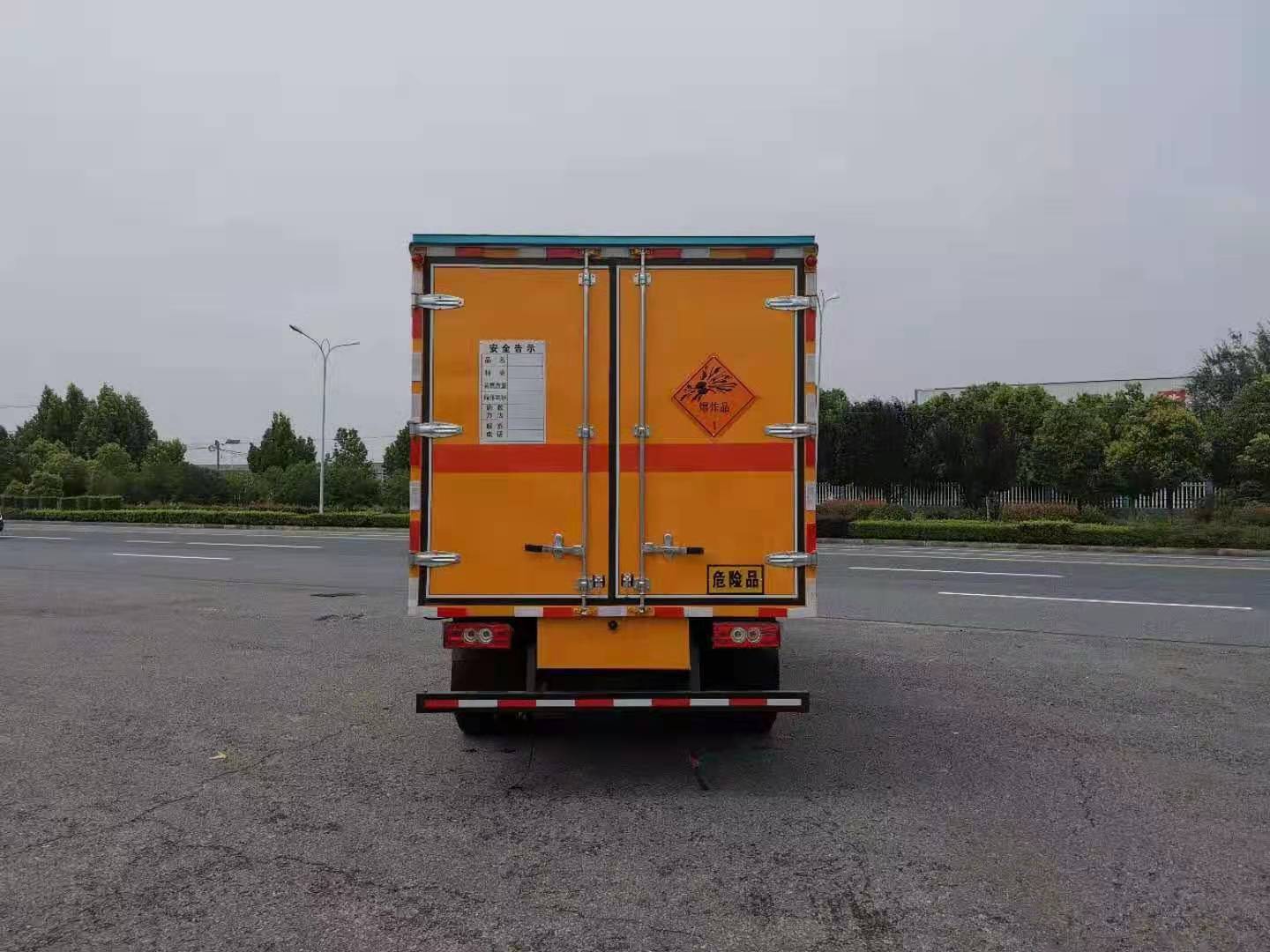 新規福田藍牌爆破運輸車采用福田危險品車專用底盤,國六排放,3360mm軸距,全柴130馬力發動機,帶原裝空調,5檔變速箱,后雙輪,中控門鎖,電動門窗。體為雙層金屬結構,外板采用靜電屏蔽冷軋鋼板,中間填充B1級阻燃泡沫,內飾為鋁板。廂體上側安裝防雨通風透氣孔。底板為花紋板(或平板),上鋪防靜電膠皮,廂體右側中開單側門。廂內兩側加裝固定貨物臥環,門框帶防盜報警器,頂部帶煙霧報警器。配備隨車工具,2個滅火器,三角頂燈,2條防靜電拖帶,貼反光標識等。其他按公告標準制作。