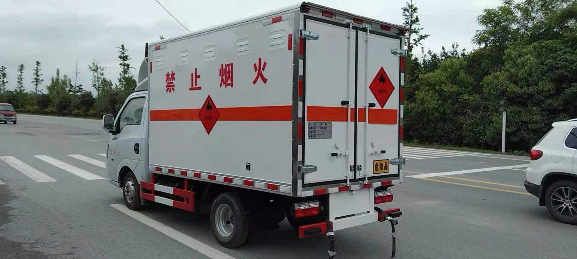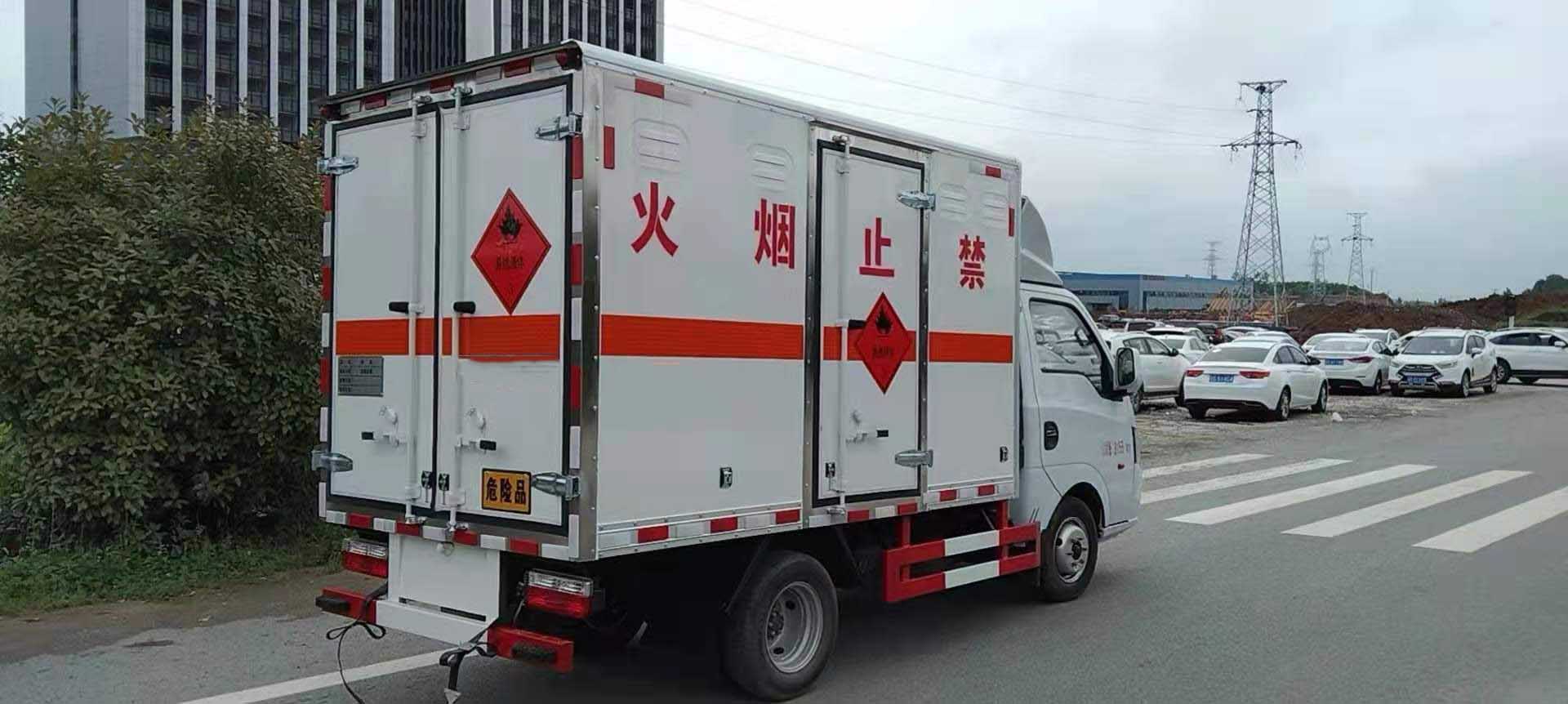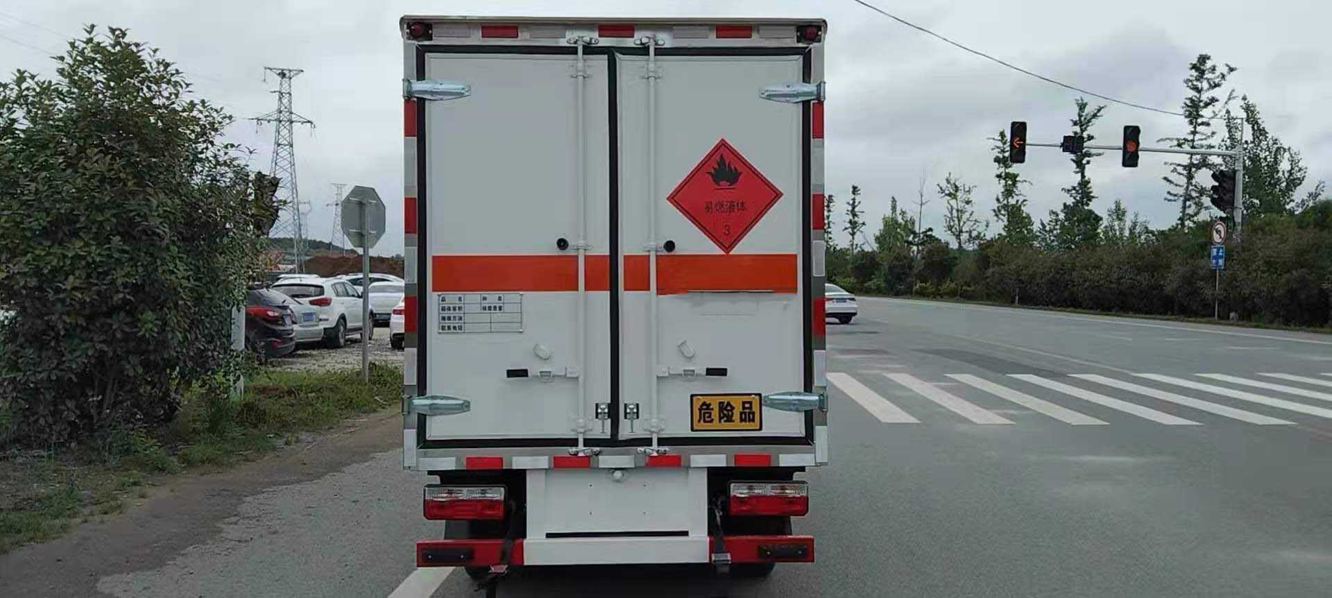 東風(fēng)途逸國(guó)六柴油易燃液體廂式運(yùn)輸車廂體采用外飾冷軋鋼板,內(nèi)飾鋁合金板,中間填充隔熱阻燃材料,廂體兩側(cè)上方設(shè)有防雨功能自然通風(fēng)窗口,底部鋪有阻燃導(dǎo)靜電膠板,廂體側(cè)面裝有固定拉環(huán),與捆綁帶使用捆綁貨物以避免移動(dòng)。在車廂內(nèi)頂部安裝感煙報(bào)警器,在門器框上方安裝有防盜報(bào)警器,廂體外側(cè)安裝示廓燈及滅火器支架,配置兩個(gè)滅火器,并有“嚴(yán)禁煙火”和“爆”等字樣,廂體周邊貼反光標(biāo)識(shí)。后門貼有安全告示,危險(xiǎn)品標(biāo)牌。車輛尾部安裝兩條拖地導(dǎo)靜電膠帶,駕駛室頂部裝有安全三角燈。廂體顏色有:黃、白、灰色等可選。