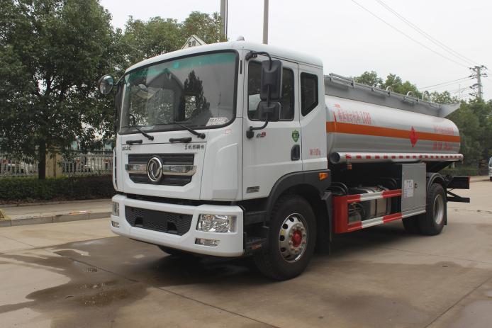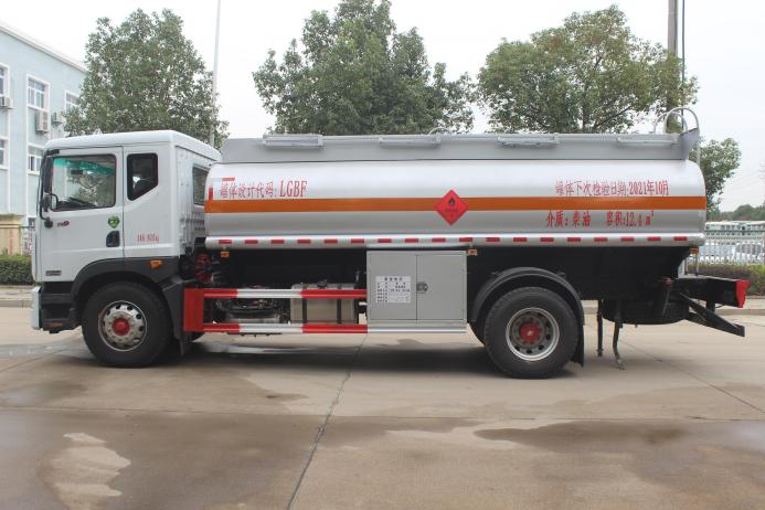 東風D9國六運油車嚴格按照公告尺寸及外形制作,公告容積: 12.4立方,罐體外形尺寸(mm):(長×寬×高)6000×2050×1300mm(實際容積12.5立方),方圓罐,山東齒輪泵(能實現泵進泵出的移動泵站功能),罐體采用Q235碳鋼鋼板制作,水壓封頭,一套全歐標配置(歐標人孔蓋、海底閥帶緊急切斷裝置、下裝油系統、油氣回收、防溢流傳感器、靜電插座等),泵進泵出口及下裝口在副駕一側,海底閥5公里駕駛室語音報警裝置,正駕一側安裝正星大流量加油機及15米絞盤,鐵制護欄,靜電卷盤,靜電拖帶,爬梯,一個工具箱,兩具滅火器,罐體顏色銀灰色,罐體左、右、后貼3個“易燃液體標識” ,配兩根與管道箱同長的輸油管及快接頭。