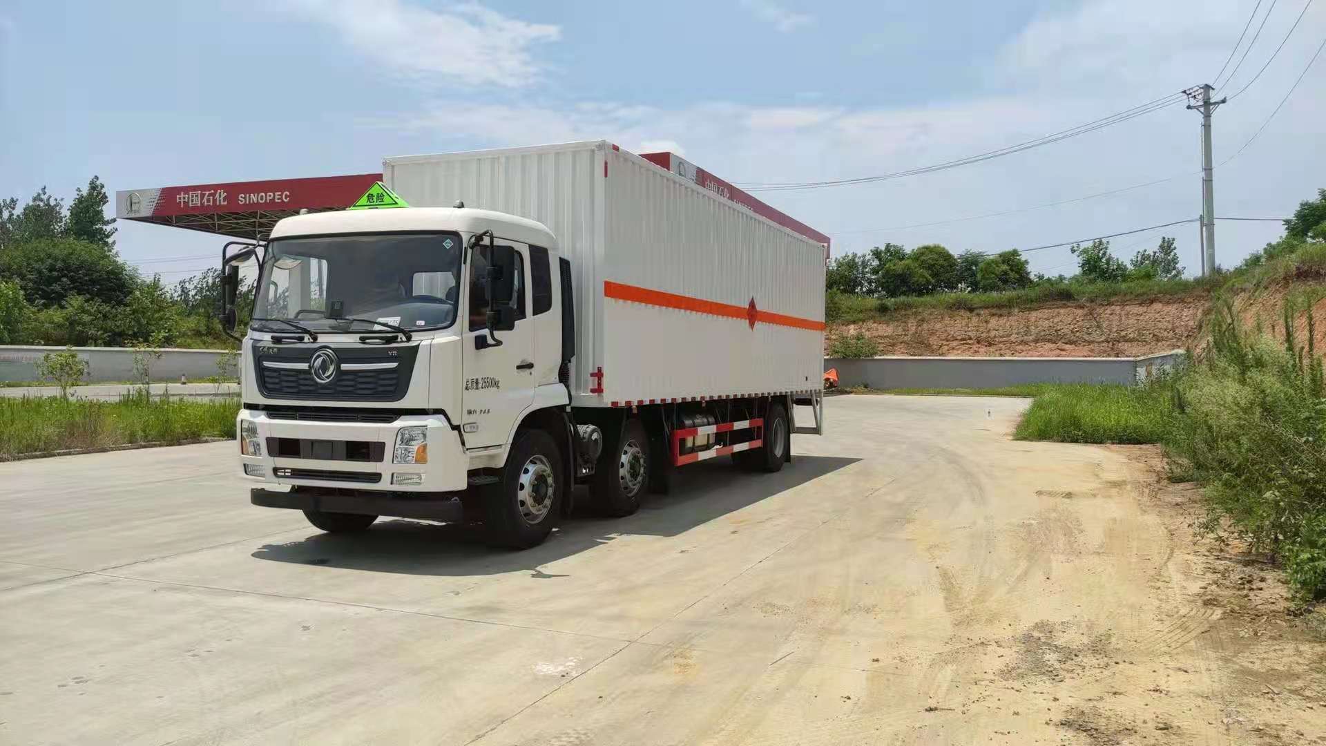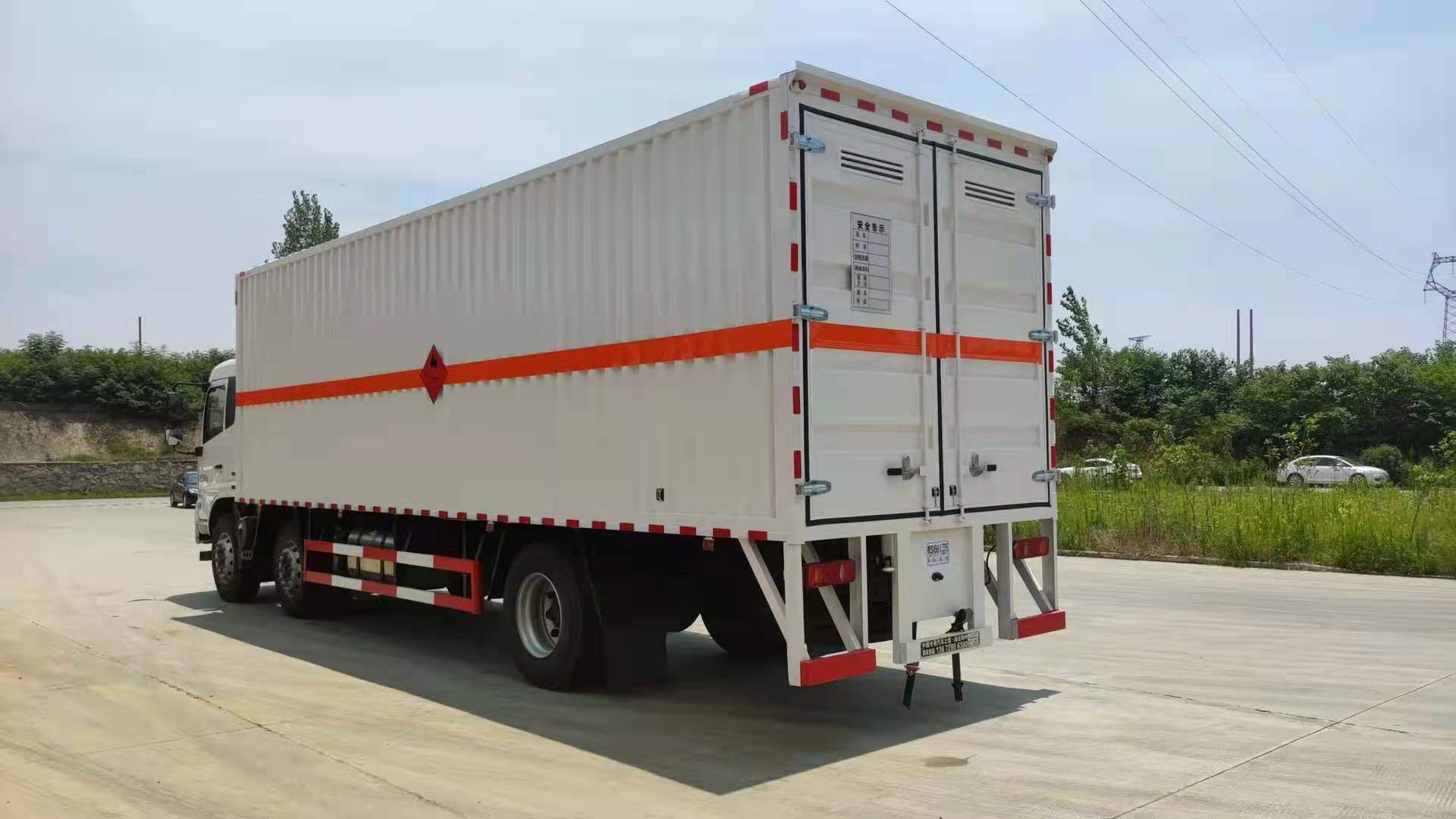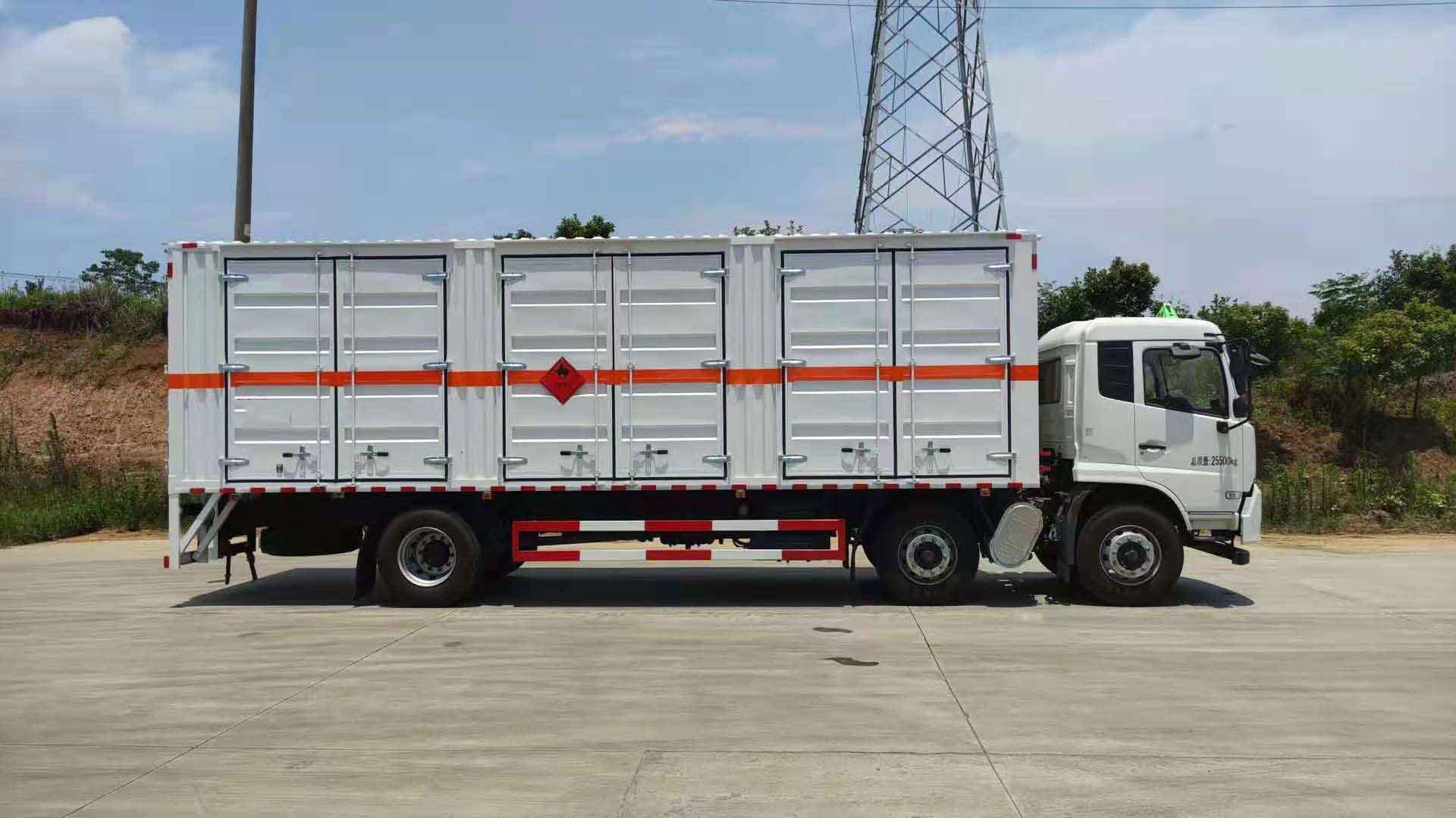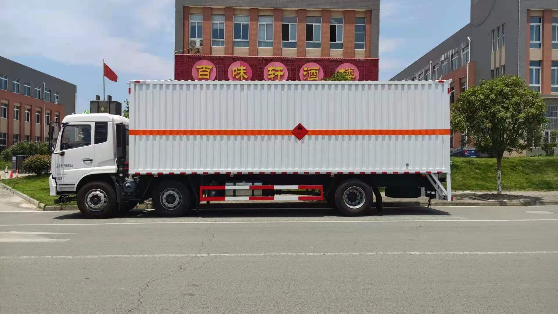 東風天錦三軸帶三開側門瓦楞板危險品車廂體為瓦楞板,內襯為矩形管骨架牢靠穩定,廂體外部上下鋁合金型材包邊,底板和車廂前下部鋪橡膠皮,后門雙開,右側為三個雙開門,內部有固定貨物的臥環,車輛外部有靜電帶、滅火器、防火罩,車廂內安裝煙霧報警器和門防盜報警器,嚴格按照國家危險品相關法規張貼。廂體外帶透氣孔,加裝液壓尾板不超重。