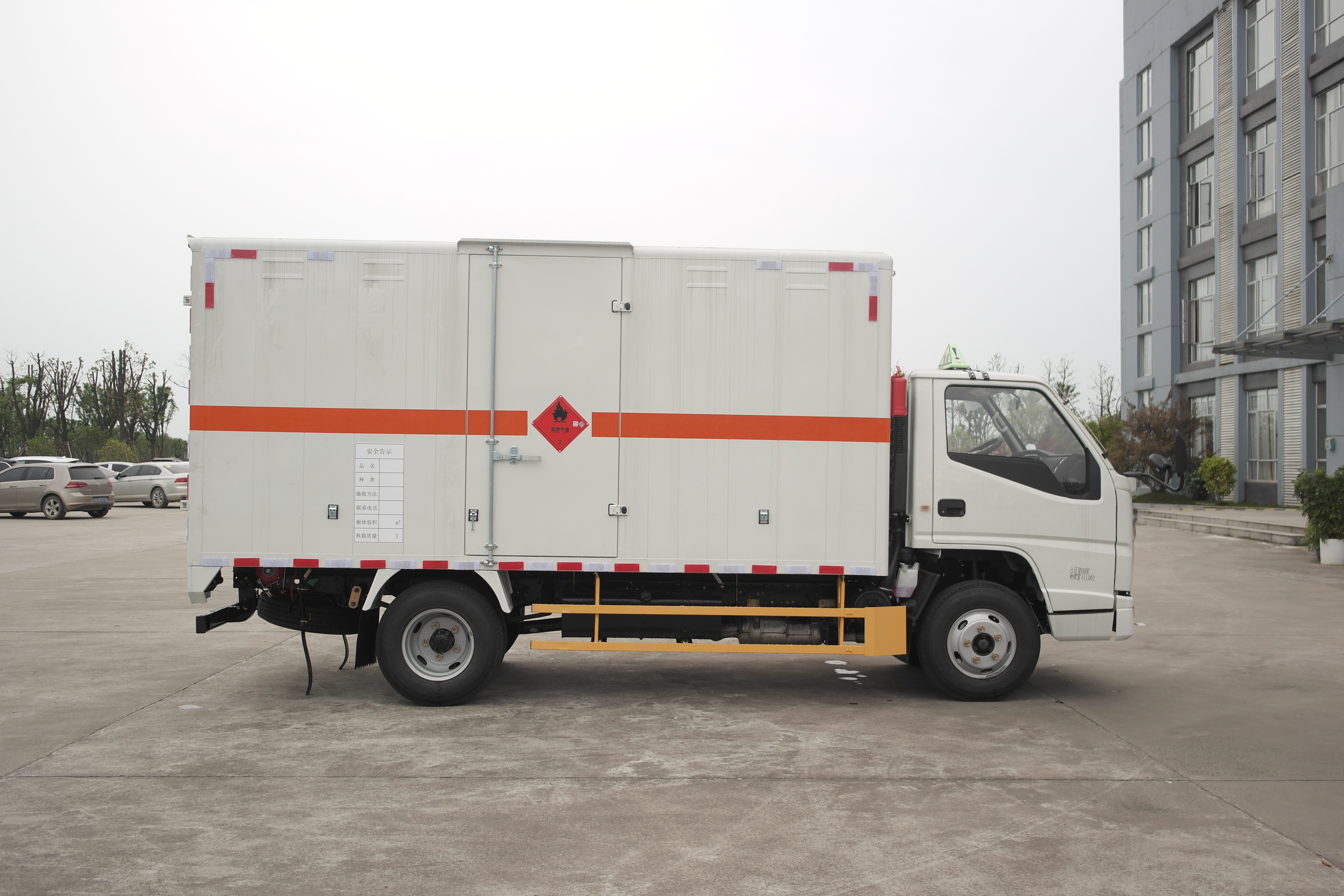 江鈴國六單層平板式危險品車采用新款順達N600窄體單排駕駛室,白色,國六排放江鈴116馬力柴油發動機(JX4D30B6H),5檔變速箱,7.00鋼絲胎,助力、油剎、中控鎖、電動車窗、排氣管前置、前盤碟剎、限速,前碰撞預警,車道偏離提醒,原廠空調。外形尺寸:(長:5995;寬:2120,2270;高:2300;),箱體尺寸:(長:4200,4150;寬:1950,2100;高:600,550;),總質量(Kg):4495;額定載質量(Kg):1445;整備質量(Kg):2920;箱體標配3個厚的花紋板,副梁標配120的槽鋼,龍門架為100的槽鋼,墻板厚度為1.2個厚的冷軋板,廂體內部選裝固定貨物的卡槽,橫梁間距為320CM,底板配有靜電膠皮,選裝液壓尾板,底板加厚,橫梁加密,平面板結構墻板,整車按照公告要求張貼反光標識,危險品標牌,安全告示等,靜電尾帶兩根,防火帽,隨車滅火器(一對),按照公告要求張貼“易燃氣體”“不燃氣體”標識。