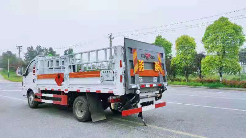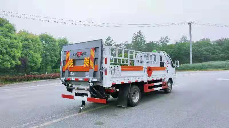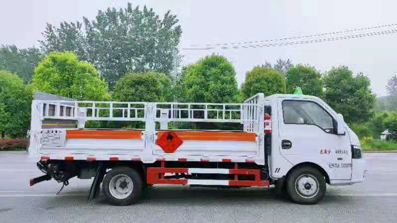 東風途逸3米8國六氣瓶運輸車廂式欄板車結構,外厚度為1.1毫米厚度武鋼冷軋鋼板(或沖壓成瓦楞板,以公告為準),內加強“幾”字型加強梁,車體底板加強處理并做防靜電處理。車體的左側、右側,和后欄板栓鉤結構,可向下打開,方便上下貨物,車體為空曠式車型,大大減少了運輸物品因為狹窄空和強烈碰撞產生氣瓶爆炸的危險性,箱體外觀涂裝白色油漆,在欄板的中間位置粘貼橙色的危化車標帶,并在車體的左、右、后部粘貼“易燃氣體”或“不燃氣體”標識。駕駛室內部配備兩只滅火器,后杠處安裝防追尾事故的緩沖固定塊。此款車輛屬于國家規定的危險品二類危險品運輸車。