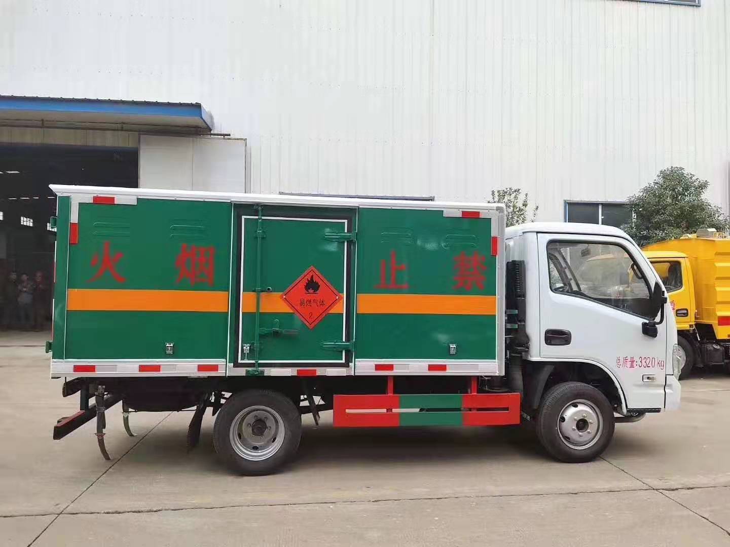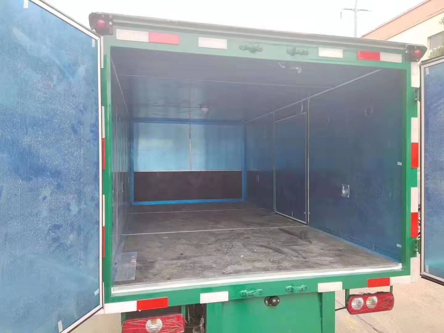 躍進可進地下車庫危險品車廂體材質為外飾冷軋鋼板、內飾鋁合金板、中間填充隔熱阻燃材料,選裝側門和隔倉,廂體兩側上方設有防雨功能自然通風窗口,底部鋪有阻燃導靜電膠板,廂體側面裝有固定拉環,與捆綁帶使用捆綁貨物以避免移動。在車廂內頂部安裝感煙報警器,在門器框上方安裝有防盜報警器,廂體外側安裝示廓燈及滅火器支架,配置兩個滅火器,并有“嚴禁煙火”和“爆”等字樣,廂體周邊貼反光標識。后門貼有安全告示,危險品標牌。車輛尾部副梁安裝兩條拖地導靜電帶,駕駛室頂部裝有安全三角燈。廂體顏色可定制:黃、白、灰色等。