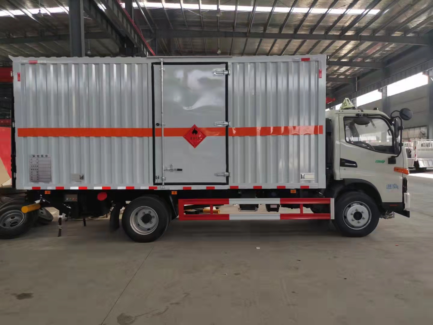 5.2米江淮駿鈴V7廂體氣瓶運輸車采用廂式欄板車結構,外厚度為1.1毫米厚度武鋼冷軋鋼板,內加強“幾”字型加強梁,車體底板加強處理并做防靜電處理。車體的左側、右側,和后欄板栓鉤結構,可向下打開,方便上下貨物,車體為空曠式車型,大大減少了運輸物品因為狹窄空和強烈碰撞產生氣瓶爆炸的危險性,箱體外觀涂裝白色油漆,在欄板的中間位置粘貼橙色的;嚇藥В⒃谲圀w的左、右、后部粘貼“易燃氣體”或“不燃氣體”標識。