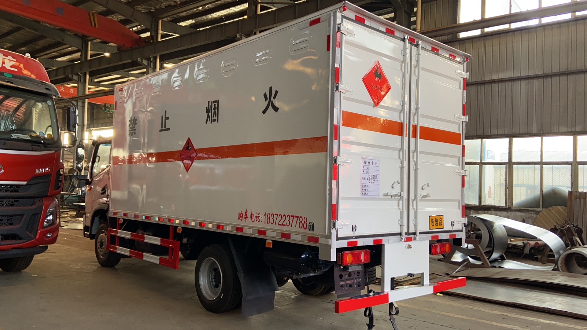 東風華神T3國六單開雙側門危險品車采用東風華神T3國六危險品車專用底盤,整車尺寸:7180x2500x2600mm,箱體內尺寸:5100x2350x2300mm,