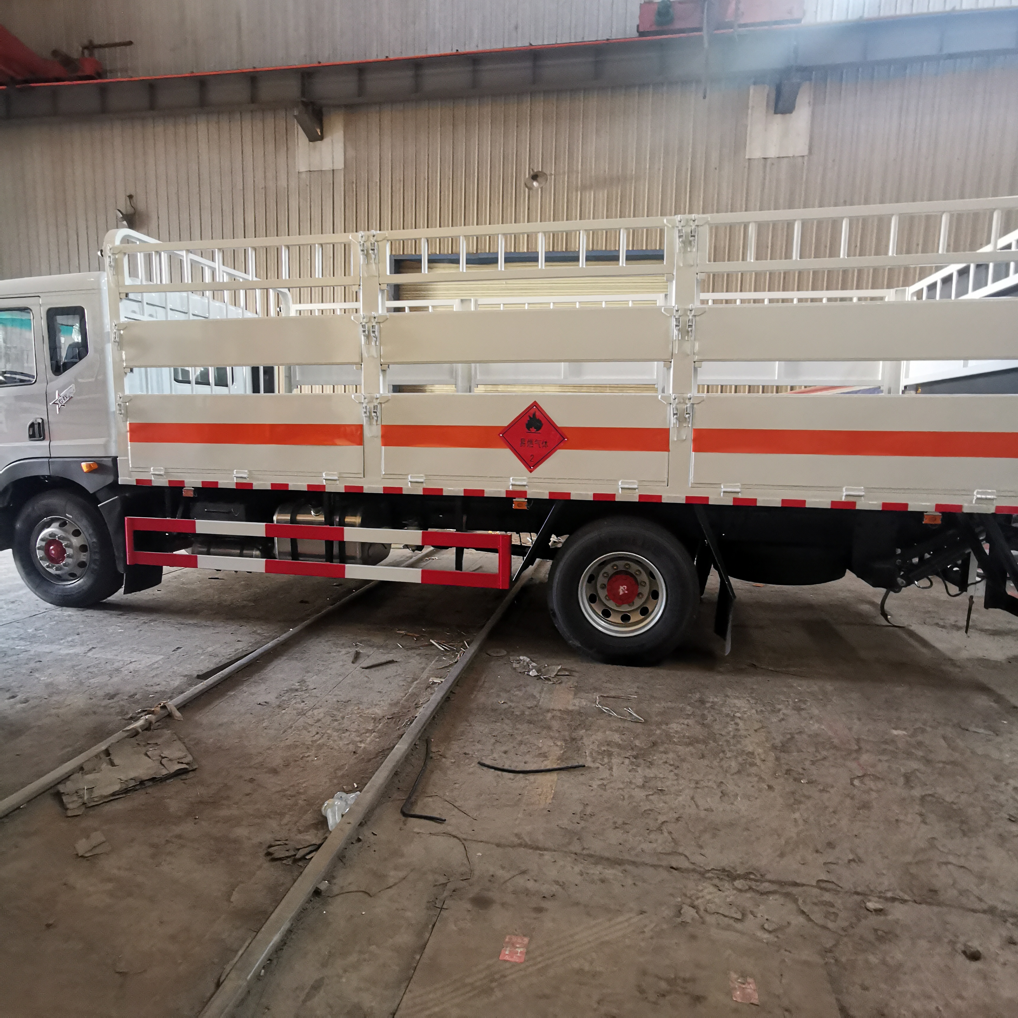 東風D9國六帶三層高欄氣瓶車采用國六東風多利卡D9危貨底盤(型號:EQ1185L9CDFWXP),汽剎&斷氣剎,康機230馬力發動機(B6.2NS6B230 ), 軸距4700mm, 前橋4.5噸,后橋10噸,標配295/80R22.5真空胎,陜齒8檔變速箱,原廠動力轉向、電磁熄火,ABS,原廠前盤碟剎制動,限速裝置,帶增壓,原廠空調,氣囊橋,防爆胎/前碰撞預警/車道偏離提醒/胎壓監測/EBS/ESC/AEBS。