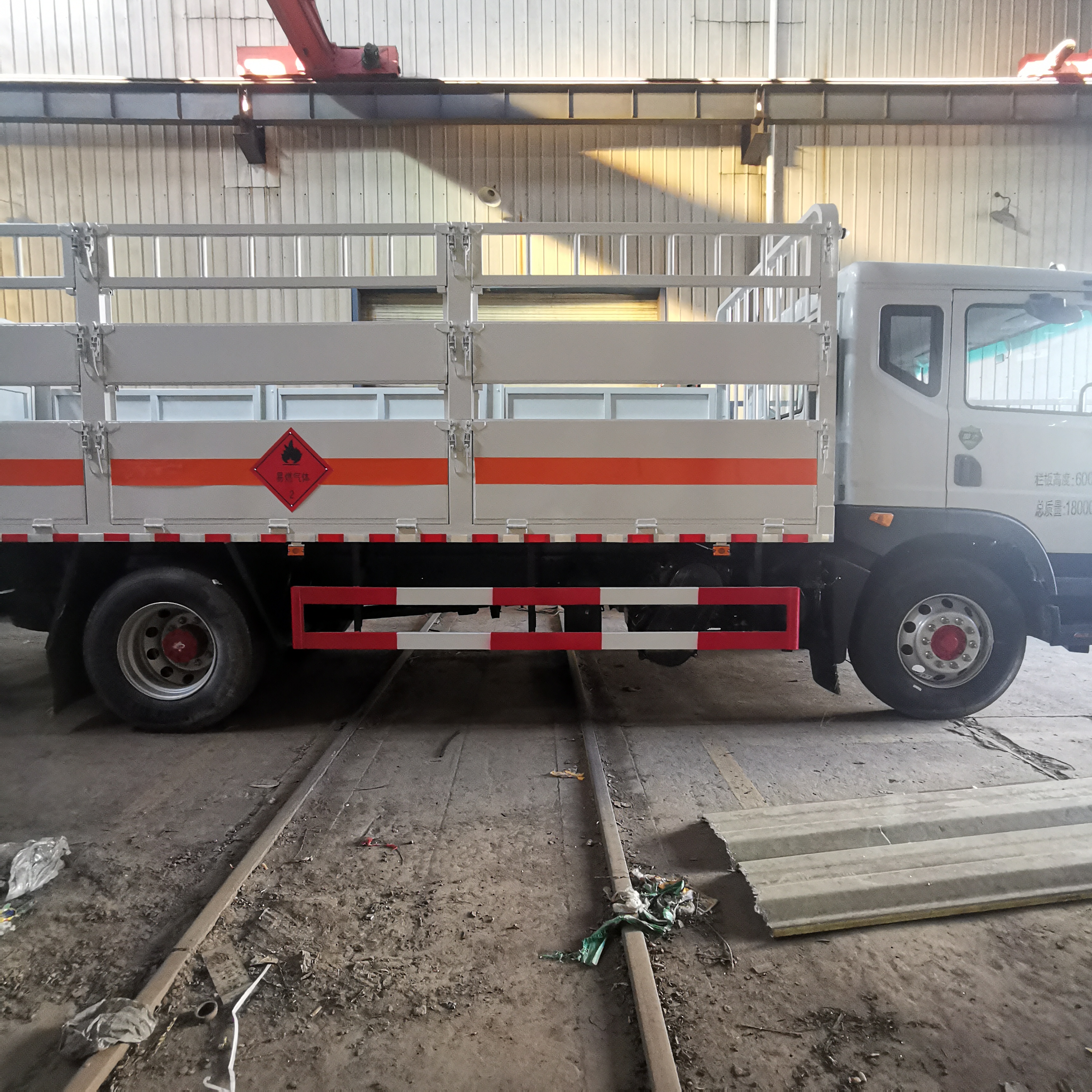 上裝配置: 氣瓶運輸車制作,嚴格按照公告尺寸,高欄式結構,貨箱尺寸:6300X2450X600mm,帶靜電帶,二個滅火器,防火罩,整車國標反光標示及警告標志,側面及后下部防護裝置材料為Q235,三個菱形標識牌,一圈橙色反光帶,一個安全告知標牌。帶接地導靜電膠帶,三角頂燈,其余標配。油漆:駕駛室白色,廂體白色,貼反光帶,反光板,貼危險品級別菱形標志,安全告示牌。 提供整車合格證,底盤合格證,一致性證書,環保清單,一車一票。
