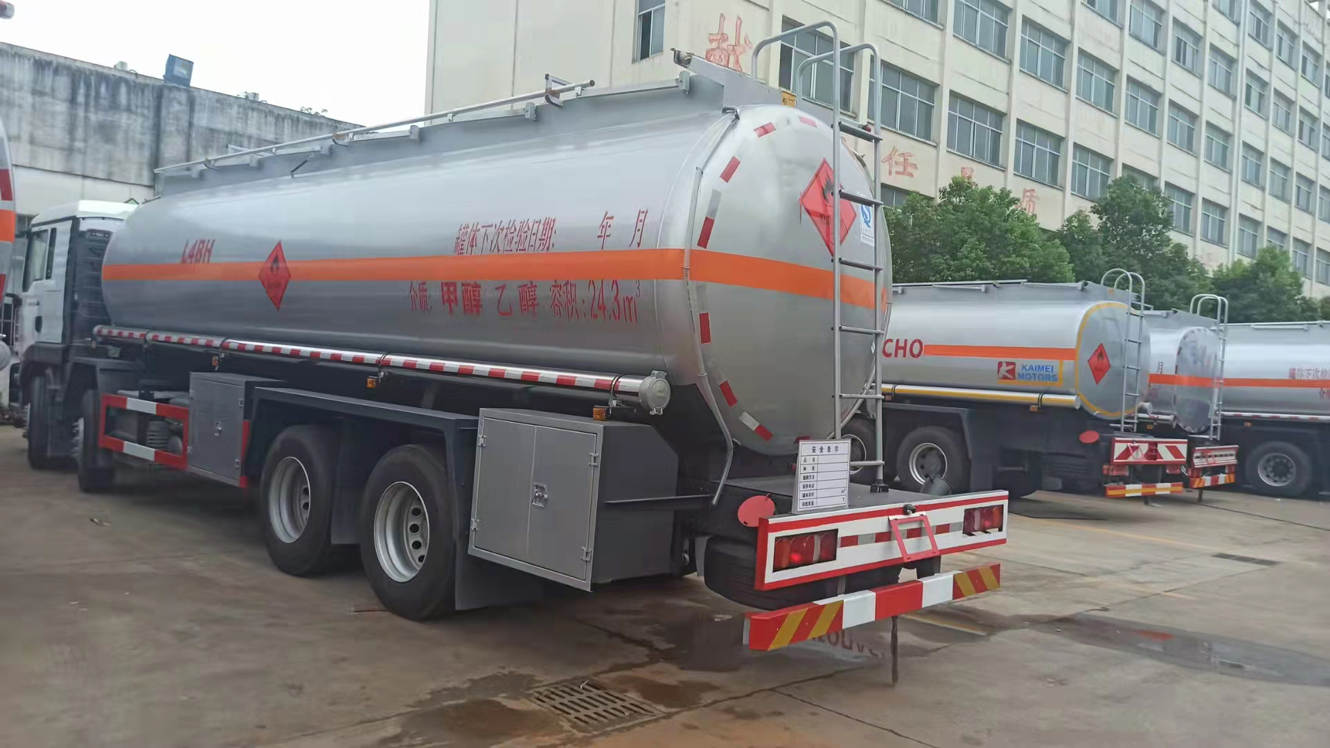 汕德卡國六前四后八甲醇運輸車采用的是平頂駕駛室,350馬力發動機,9檔變速箱,軸距1800+4575+1400mm,轉向輪爆胎應急裝置;選裝倒車蜂鳴器;選裝胎壓監測系統;選裝危險品標志燈。公告有效容積:24.3立方,罐體尺寸:8800×1980mm,正圓形罐體,國標厚度,分雙倉,帶甲醇化工泵,泵進泵出在尾部,兩個甲醇專用罐口、兩個海底閥,帶語音提示報警裝置,帶兩套安全閥及爆破片,帶真空閥,介質:甲醇,乙醇,丙酮,異丙醇。