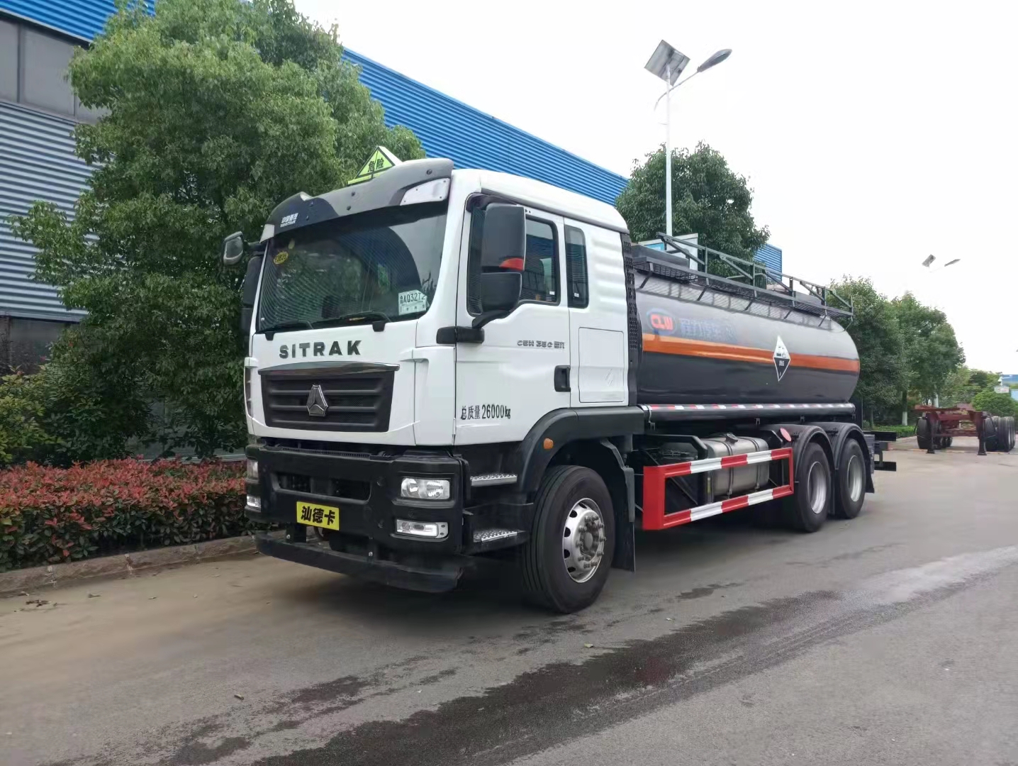 重汽汕德卡后雙橋易燃液體罐式運輸車罐體及整車尺寸嚴格按公告制作,罐體材料采用Q235B型4.2mm(≥4.05mm),封頭4.2mm(≥4.05mm),罐體通倉,帶山東銅芯泵,泵進出口在副駕大梁一側,一套普通罐口,帶一套爆破片,尾部爬梯。配一個防火帽,兩根輸油管,兩個滅火器,帶一個工具箱。其余廠內標配。油漆可選銀灰色,貼反光條,貼反光帶,安全告示。出具整車證,底盤證,罐檢及發票。