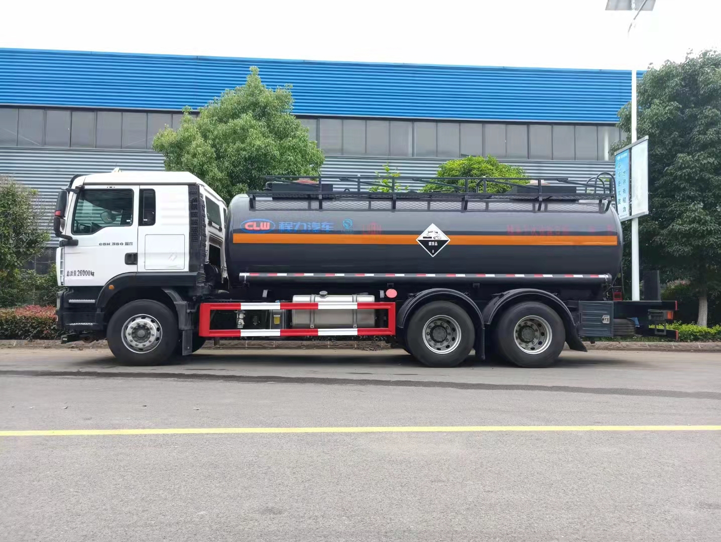 重汽汕德卡后雙橋易燃液體罐式運輸車罐體容積16立方,安全達標也下;采用汕德卡 G5半高頂駕駛室 ;WP8.350E61發動機;HW13709XSTC2變速箱+HW70法蘭式取力器;VPD75D前軸(盤);MCY11BGS自調臂雙后橋(鼓);速比4.63;雙層車架(8+4/280);前少后空氣懸架(3/-/-);博世方向機;前置排氣系統;EBS+ESC;高位保險杠(全金屬);295/80R22.5(縱向花紋/全輪位);400L油箱;LDWS+FCWS;旋鈕式PTO;中國重汽智能通B版;電磁式電源開關;轉向輪爆胎應急裝置;選裝倒車蜂鳴器;選裝胎壓監測系統;選裝危險品標志燈。