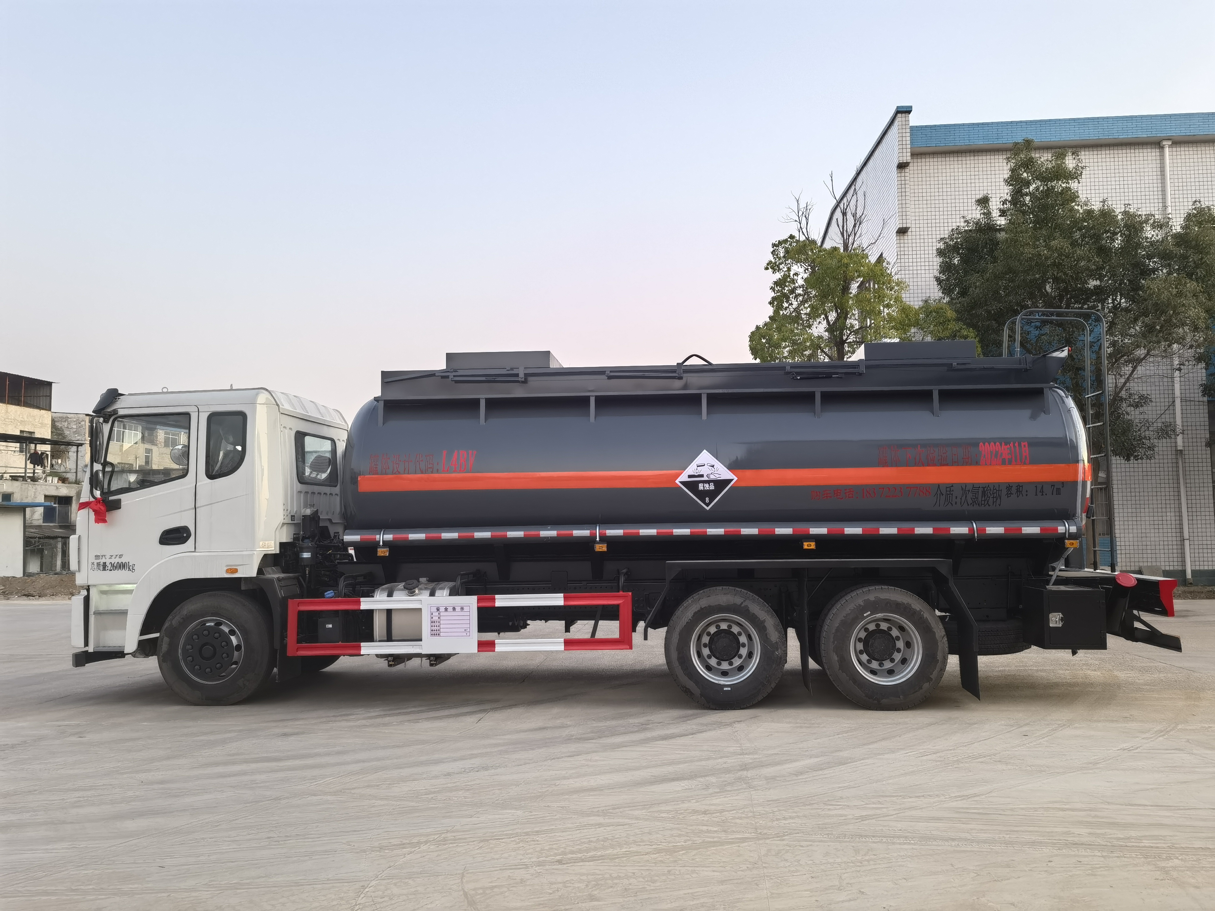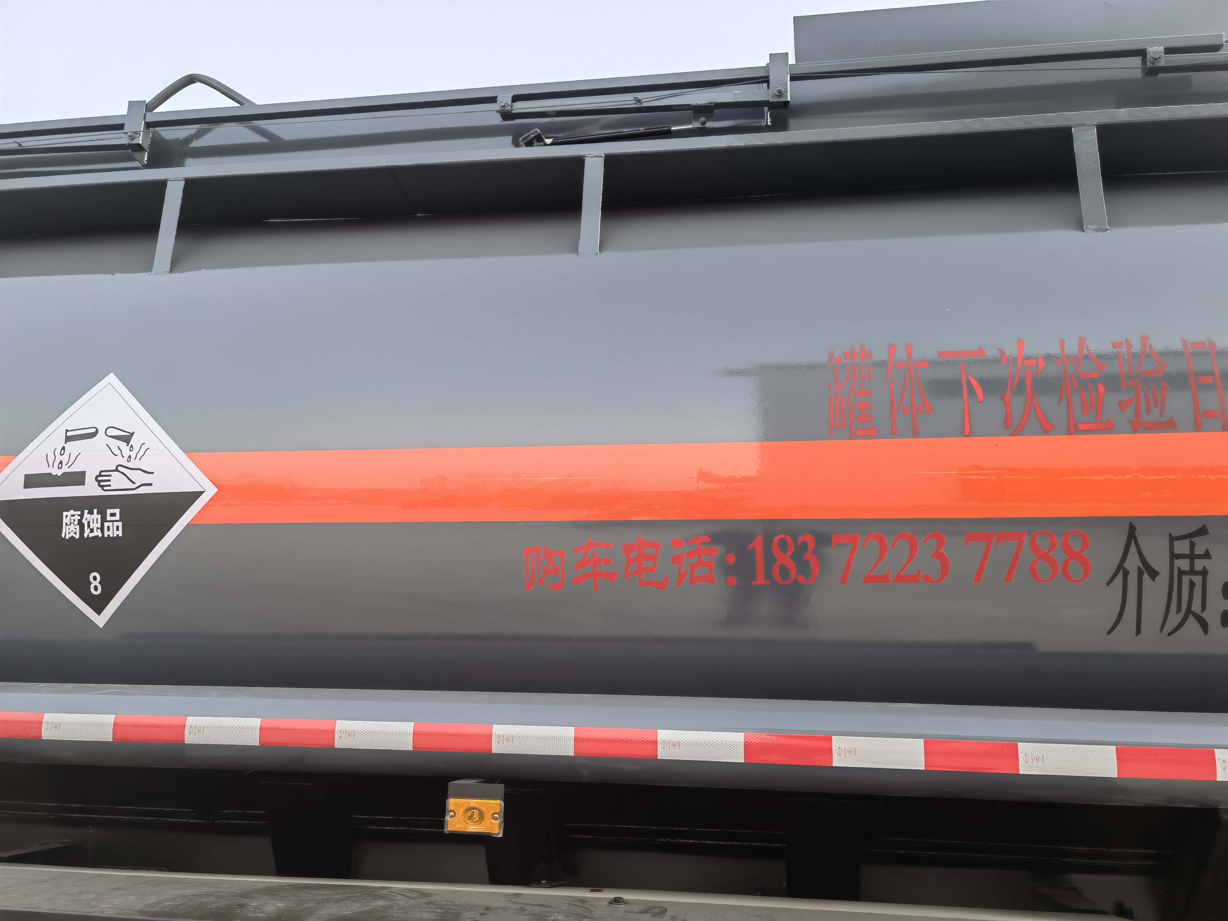 2、上裝標準配置:嚴格按公告尺寸及外形制作,罐體容積14.7立方,介質:鹽酸,硫酸,次氯酸鈉,雙氧水,罐內襯16mm聚乙稀,罐頂貳個鋼襯塑進料口,罐體底部一個DN100不銹鋼襯四氟海底閥,罐體后左右各一個DN80的襯塑球閥,帶襯塑出料口及堵蓋,罐頂防腐處理,爬梯在罐體尾部,罐體顏色為深灰色,貼反光條反光板,尾部兩塊反光板,兩具滅器,一個工具箱,配兩根與管道箱同長的輸液管,其它按公司正常標準制作。按新規制作。
