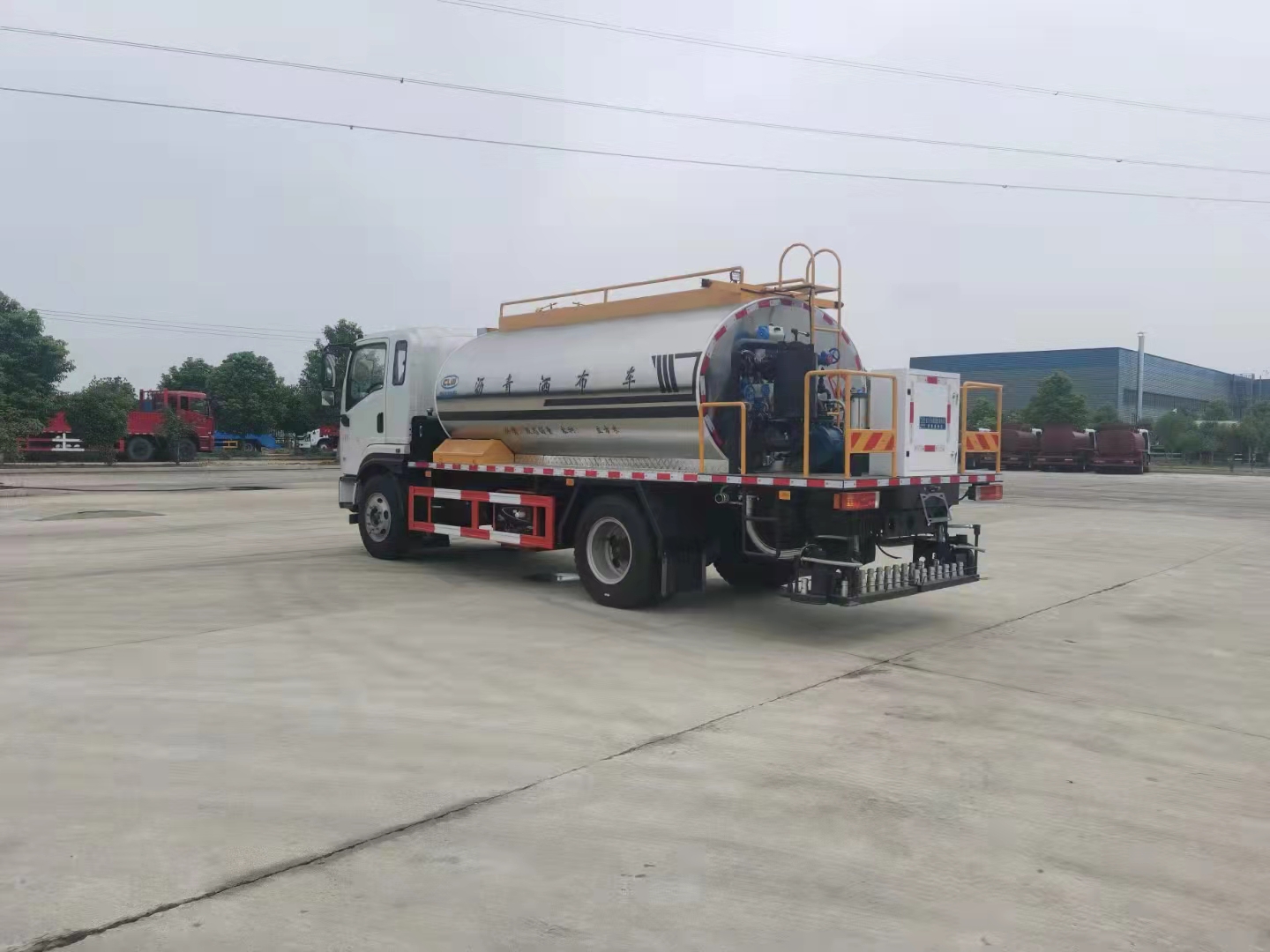 8噸陜汽軒德X9國六智能型瀝青撒布車上裝采用的高粘度瀝青泵QGB680。進口液壓比例閥。日升牌散熱器。安徽長源齒輪油泵。浙江寧波液壓馬達(AKS05-110)驅動瀝青泵。駕駛室內觸屏及尾部平臺手動控制,對尾部 34個瀝青噴嘴一對一控制。升溫方式,柴油燃燒器(意大利利雅路G20)加熱導熱油循環升溫。配備7千瓦汽油發電機。灑布量:0.3-3L/㎡,灑布寬度4.5米。主要噴灑乳化瀝青、熱瀝青、SBS改性瀝青等。