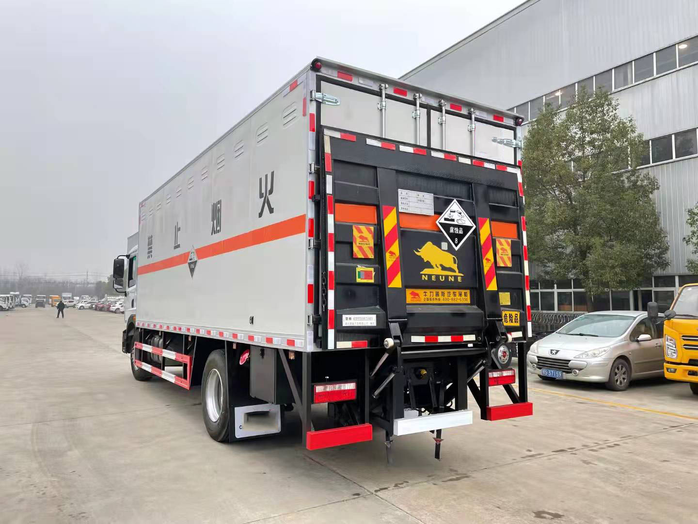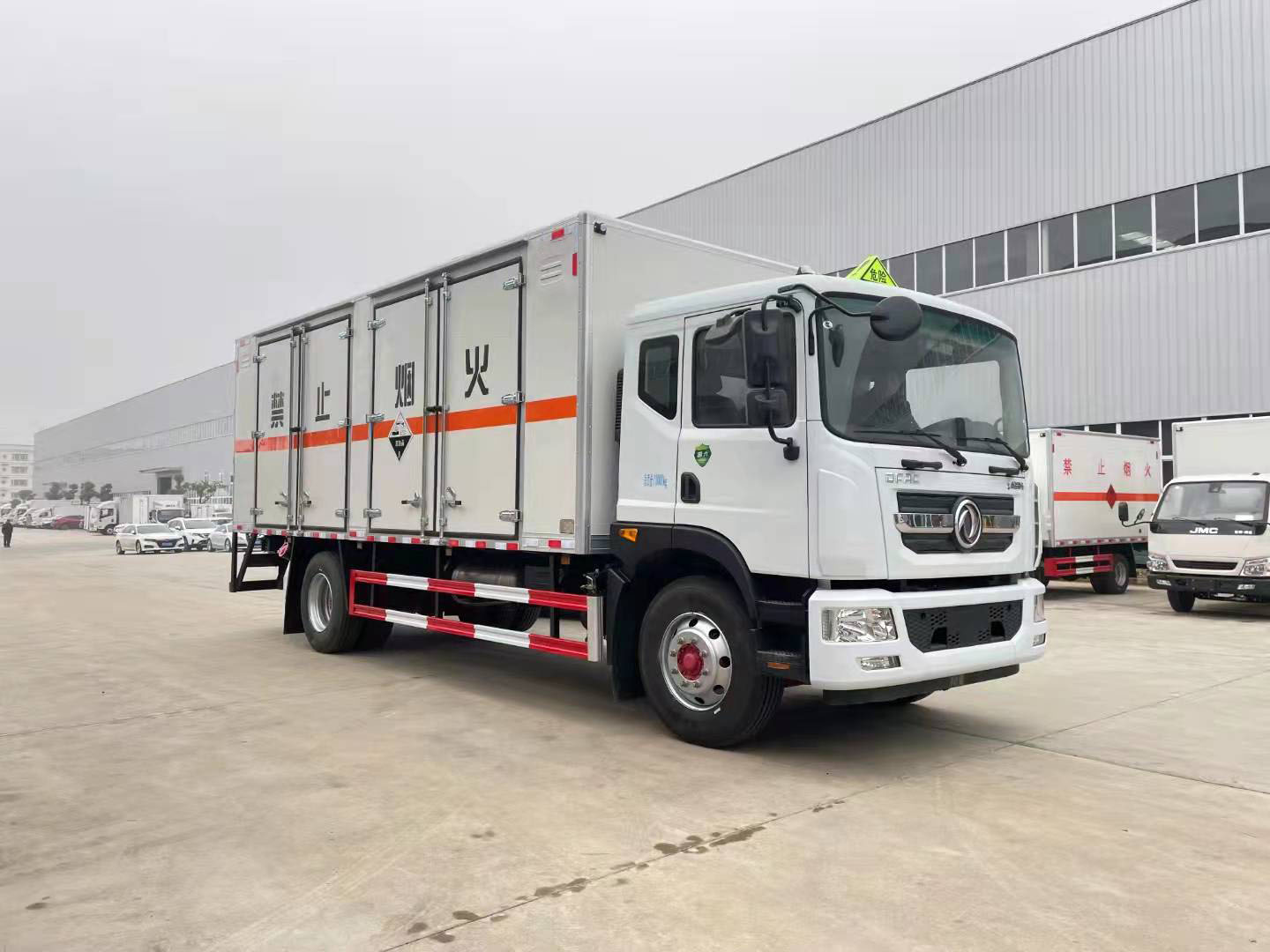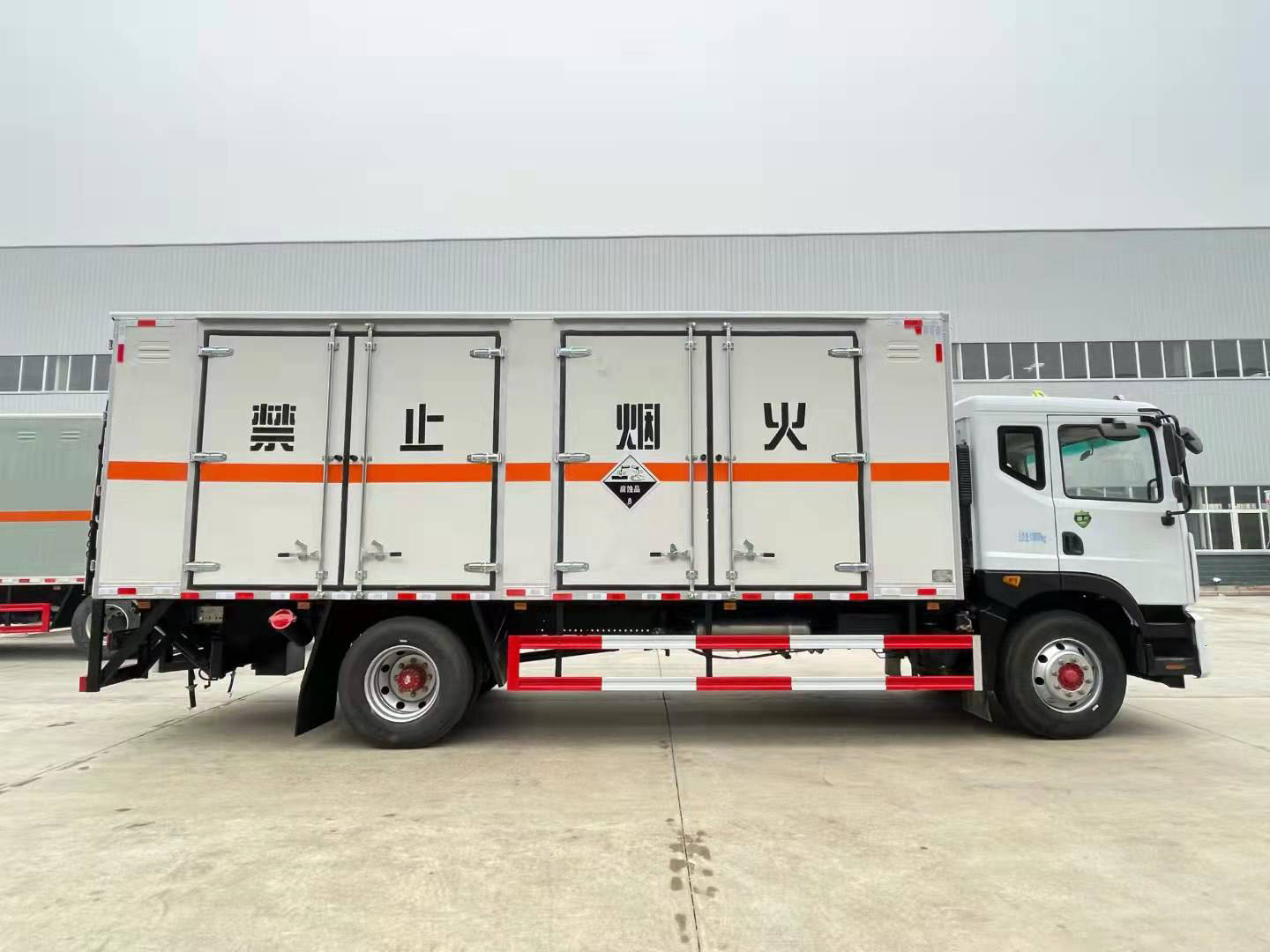 東風(fēng)D9國(guó)六帶雙側(cè)門腐蝕品廂式車可選瓦楞箱體和復(fù)合板箱體。當(dāng)廂體為瓦楞板結(jié)構(gòu),廂體內(nèi)部做防靜電處理,廂體底部鋪導(dǎo)靜電膠板,車輛副梁配備導(dǎo)靜電帶,廂體內(nèi)頂部安裝煙感報(bào)警器,廂體安裝防盜報(bào)警器,隨車配備手提滅火器,危險(xiǎn)品三角燈,防護(hù)帽等,嚴(yán)格按照國(guó)家危險(xiǎn)品法規(guī)進(jìn)行標(biāo)識(shí)粘貼等。