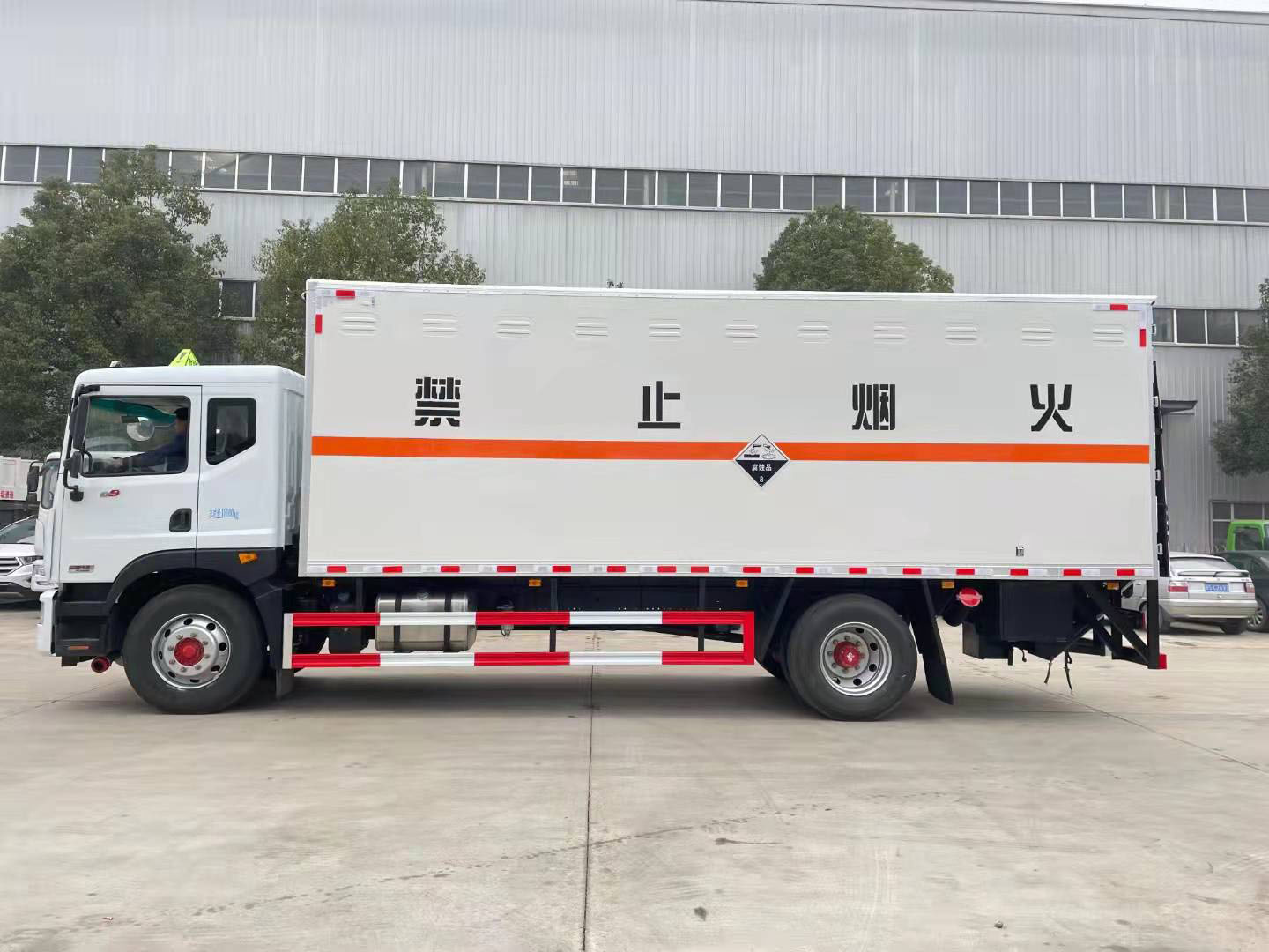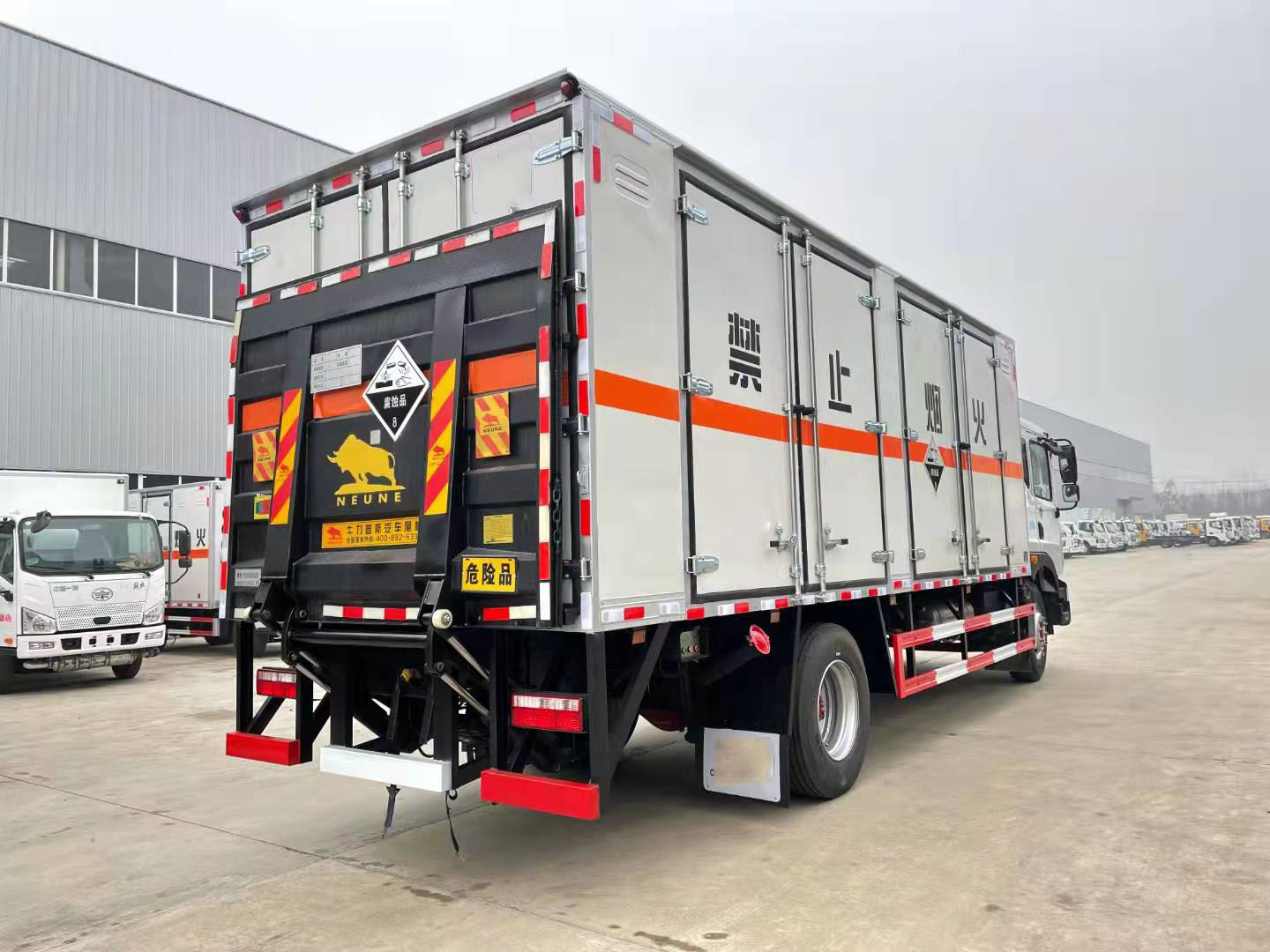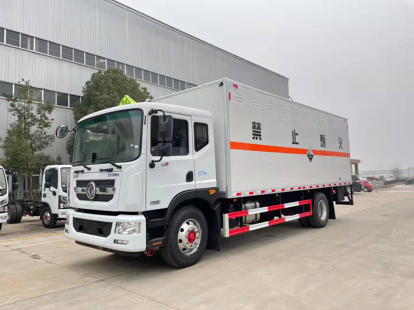 東風(fēng)D9國(guó)六帶雙側(cè)門腐蝕品廂式車可選瓦楞箱體和復(fù)合板箱體。當(dāng)廂體為瓦楞板結(jié)構(gòu),廂體內(nèi)部做防靜電處理,廂體底部鋪導(dǎo)靜電膠板,車輛副梁配備導(dǎo)靜電帶,廂體內(nèi)頂部安裝煙感報(bào)警器,廂體安裝防盜報(bào)警器,隨車配備手提滅火器,危險(xiǎn)品三角燈,防護(hù)帽等,嚴(yán)格按照國(guó)家危險(xiǎn)品法規(guī)進(jìn)行標(biāo)識(shí)粘貼等。