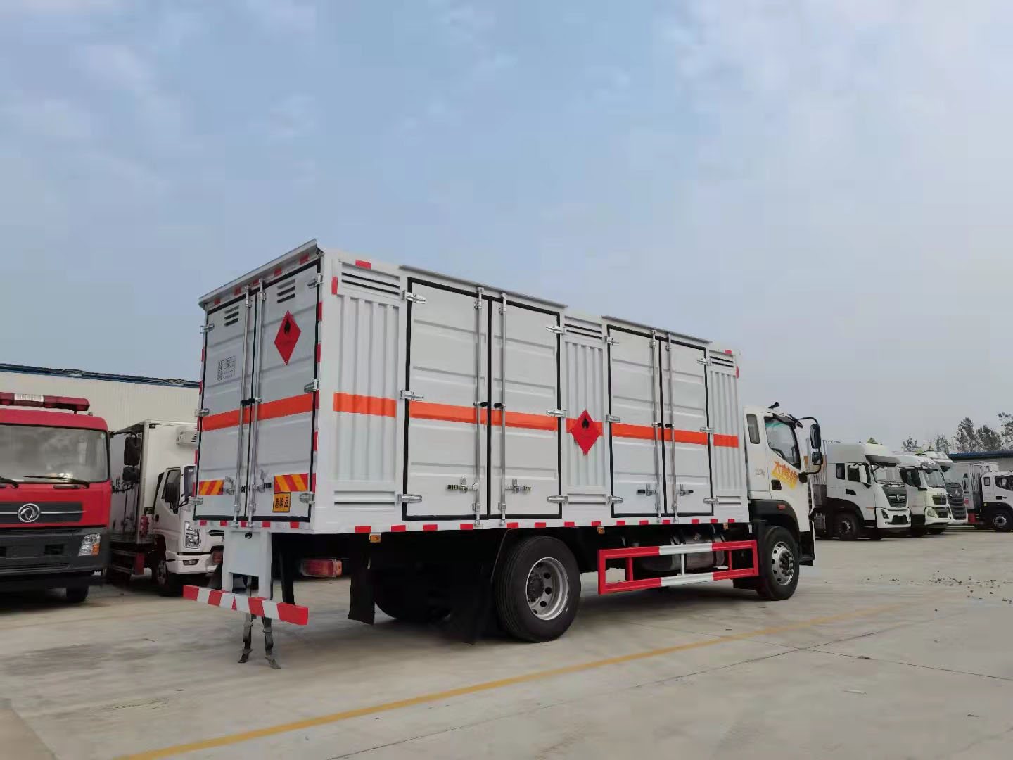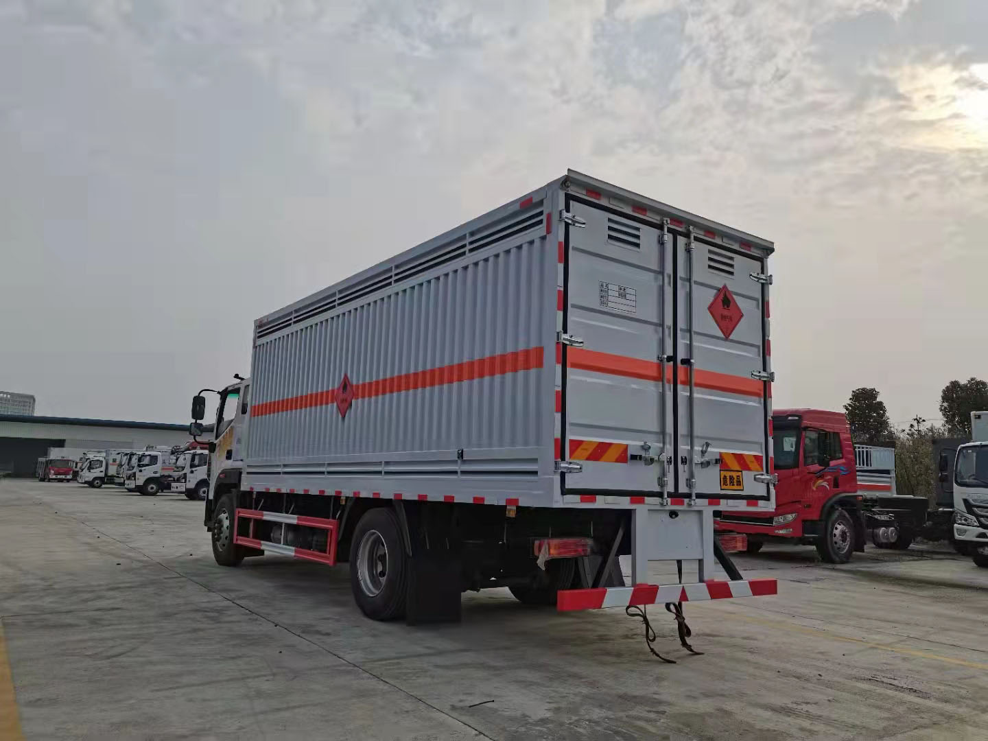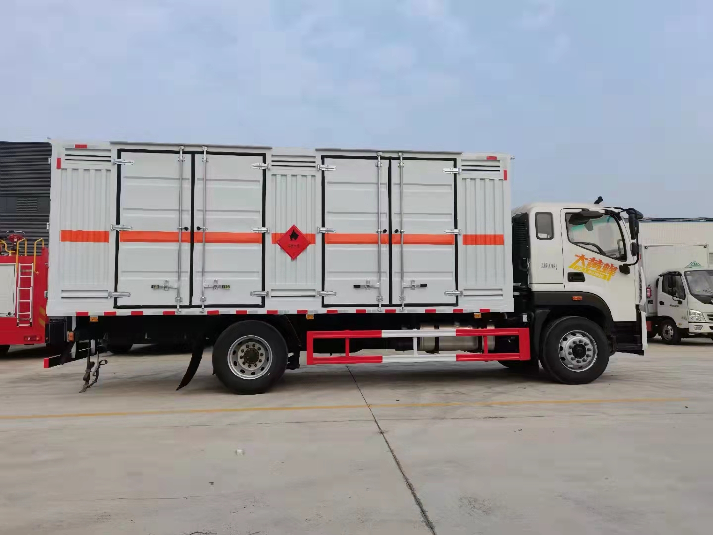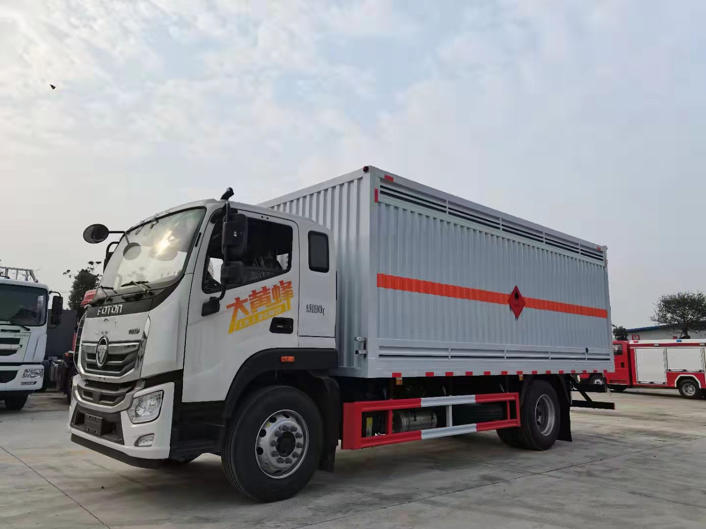 福田歐航6米8國六危化品車外形尺寸:8600*2550*3500,廂體內(nèi)部尺6200*2400*2200,廂體為單層瓦楞板結(jié)構(gòu)。底板為花紋板,上鋪防靜電膠皮。廂體右側(cè)開2對(duì)雙側(cè)門,上百葉窗下透氣孔,廂體前墻板及后門位置如公告圖片所示:后門位置做兩扇百葉窗戶,后部帶防盜報(bào)警器,頂部帶煙霧報(bào)警器,其他嚴(yán)格按照公告制作。