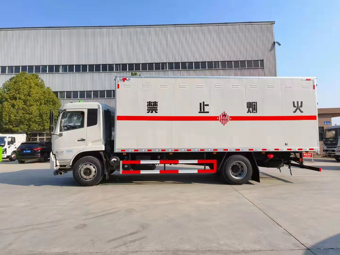 額載10噸廂長6.85米東風天錦易燃固體廂式運輸車雙面夾層結構,外板采用免漆板有一次性沖壓成型的百葉窗,內飾為導電性能良好的鋁板有透氣孔,復合加鉚合工藝,內襯為矩形管骨架牢靠穩定,骨架內部填充為透氣防潮阻燃材料。廂體外部四周鋁合金型材包邊。鋪靜電膠皮,隨車配有靜電帶,滅火器,危險品三角頂燈。整車國標反光標示及警告標志。尾部可選裝液壓升降尾板,卸貨方便。